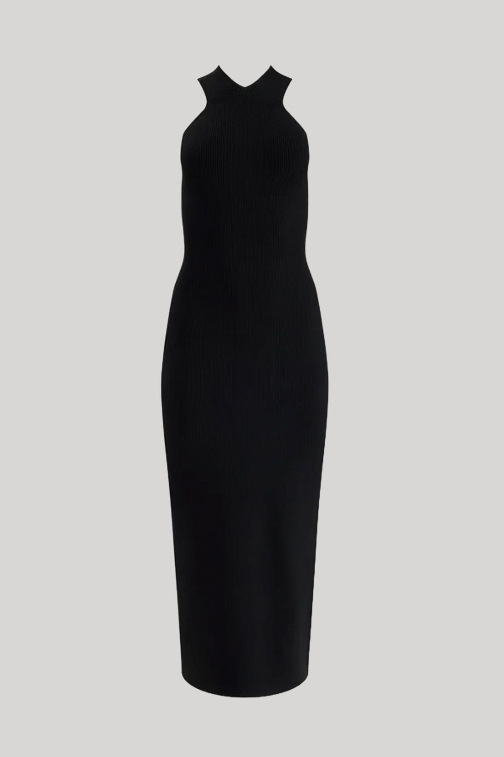 The Winnie dress is a refined knit silhouette, cut in a ribbed stretch fabric for a close, streamlined fit. It features a clean halter neckline and a straight midi length.