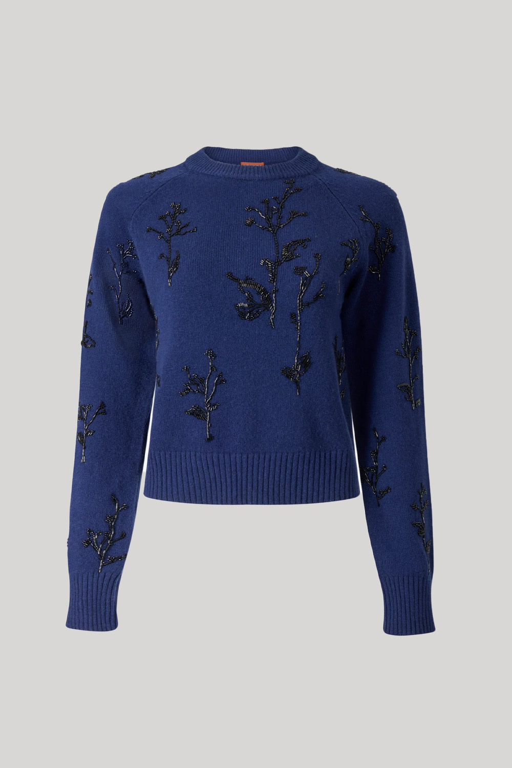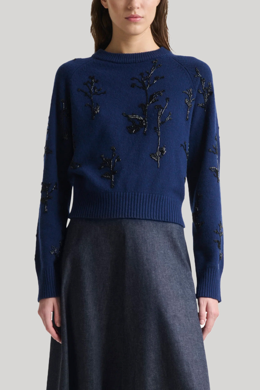 The Paulie Sweater is embellished with sparkling beads, placed to depict delicate branches and leaves. The virgin wool base is super soft and it's finished with rib-knit trims.