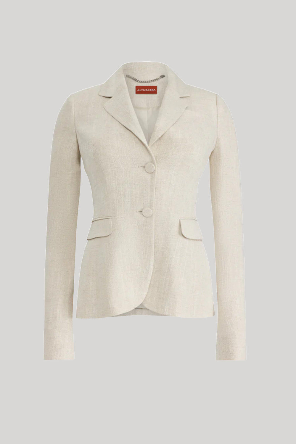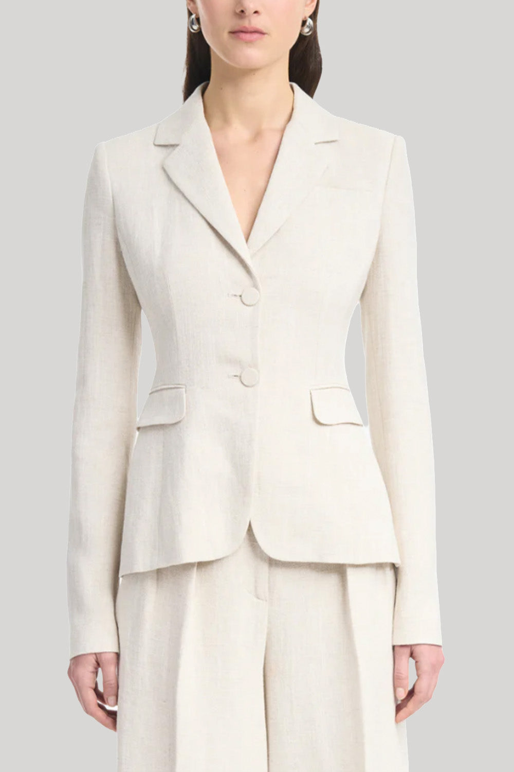 The Fenice Jacket is a classic suiting style, cut in a signature linen blend to a slim silhouette with structured shoulders and a neatly tailored waist. It features high notched lapels, a single jetted chest pocket, and front flap pockets.