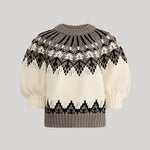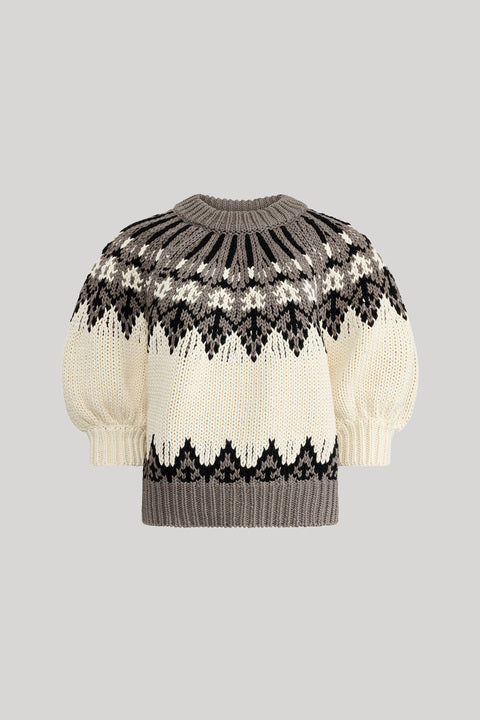The Marty sweater is designed with a traditional Fair Isle pattern. Knitted from a soft Mako cotton, typically used for its exceptional fineness and silky feel, it's shaped for a looser fit with half balloon sleeves.