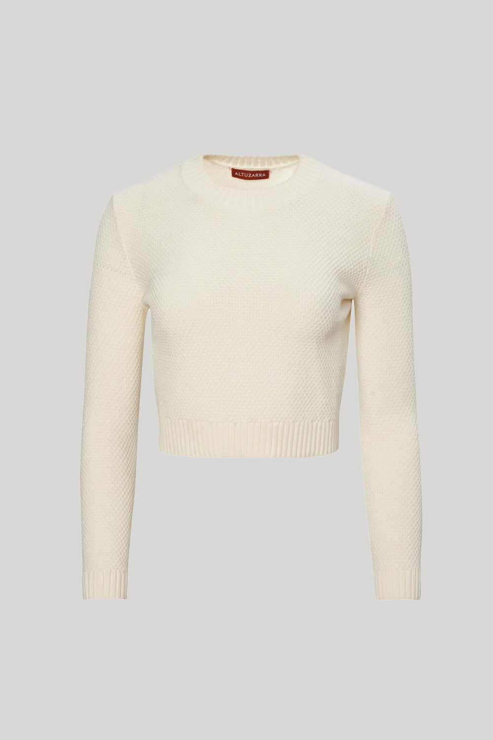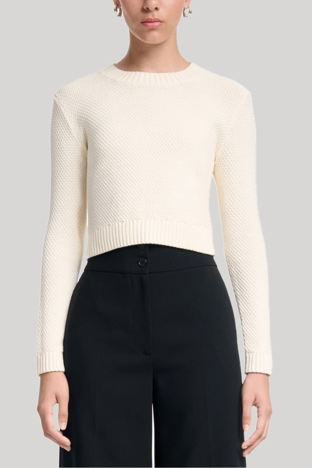 The Pogo sweater is a wardrobe staple, knitted from a soft cotton blend with a textured weave. The shrunken design is finished with a ribbed collar, cuffs, and hem.