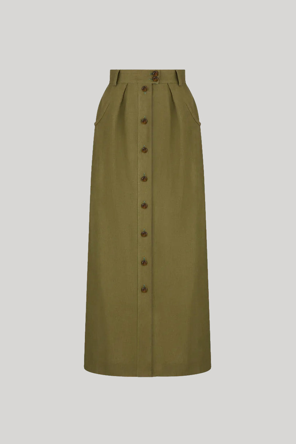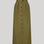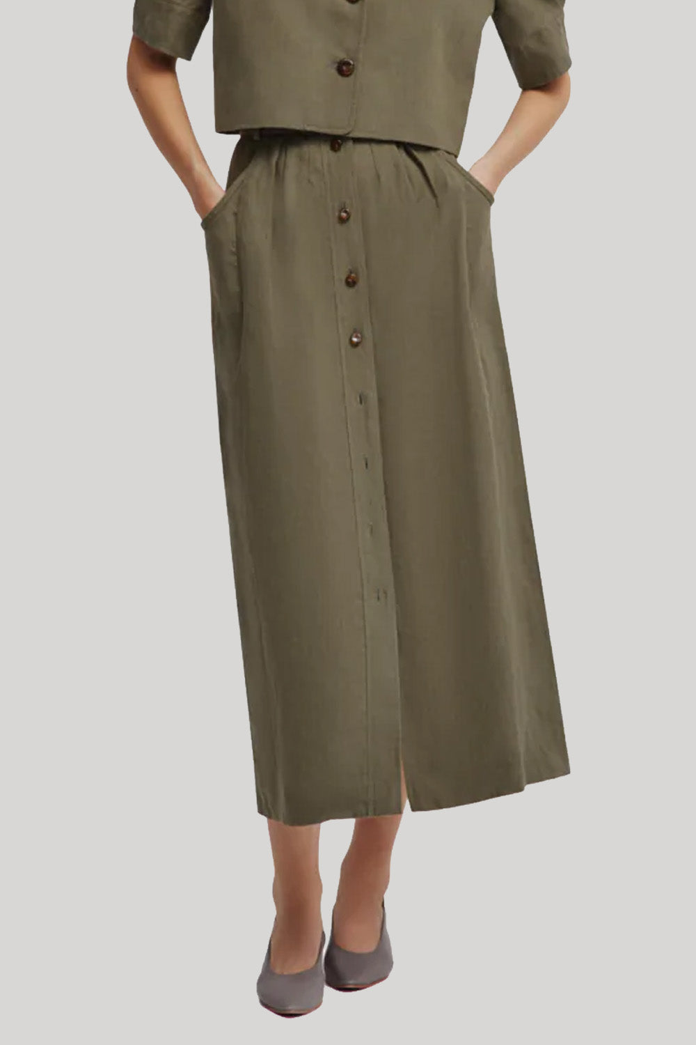 Making its debut in the Resort 2026 collection, the Mid-Day Nija Skirt is crafted from lightweight linen in a soft palm green hue. Its clean line is enhanced by front pleats and a high-rise waist, creating a refined, sartorial feel. Designed to be worn from morning to evening, it also works beautifully as a total look with the Mid-Day Lola Jacket.