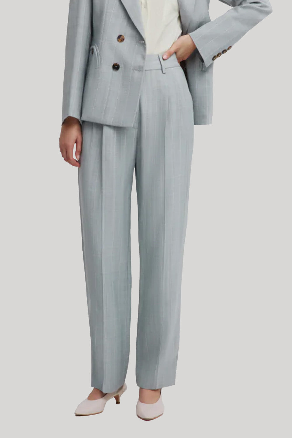 A delicate striped pattern defines the After You Fox Pants in pastel blue. This BLAZÉ Milano signature style features front pleats and crease, a high-rise waist and a straight leg, making it ideal for the office or formal occasions. Wear them as a coordinated set with the Charmer Blazer or the Everynight style in the matching fabric.