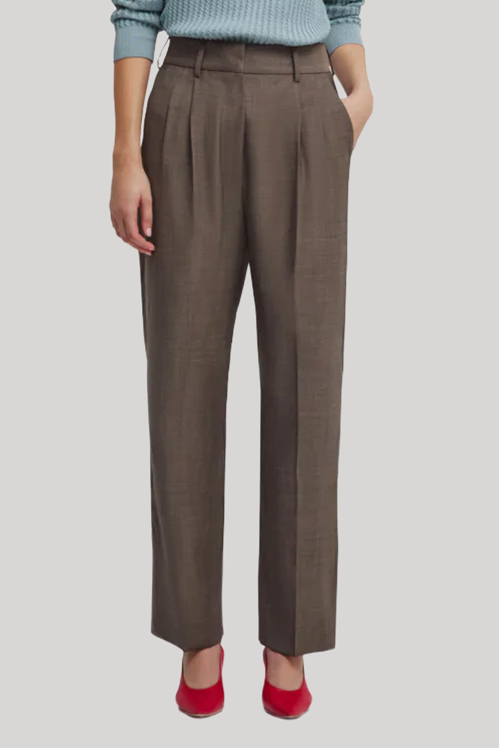 The tailored cut of the Fox Pants is enhanced by a wool and mohair blend in the Aile Malt version, rendered in a warm malt tone. The straight leg with front pleats creates a clean, elongated silhouette, striking a balance between structure and comfort. A versatile style to pair with the coordinating blazers from the collection.