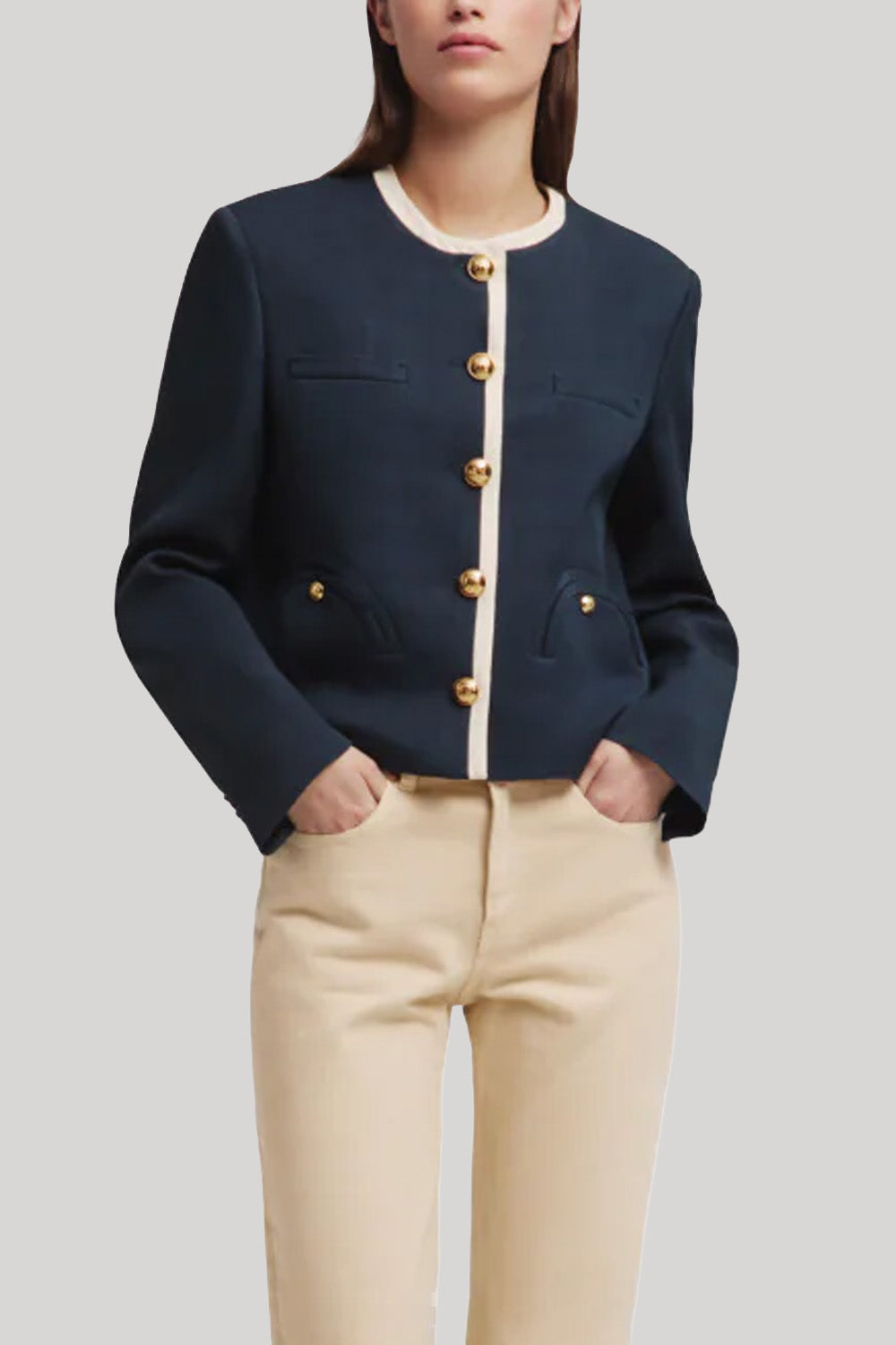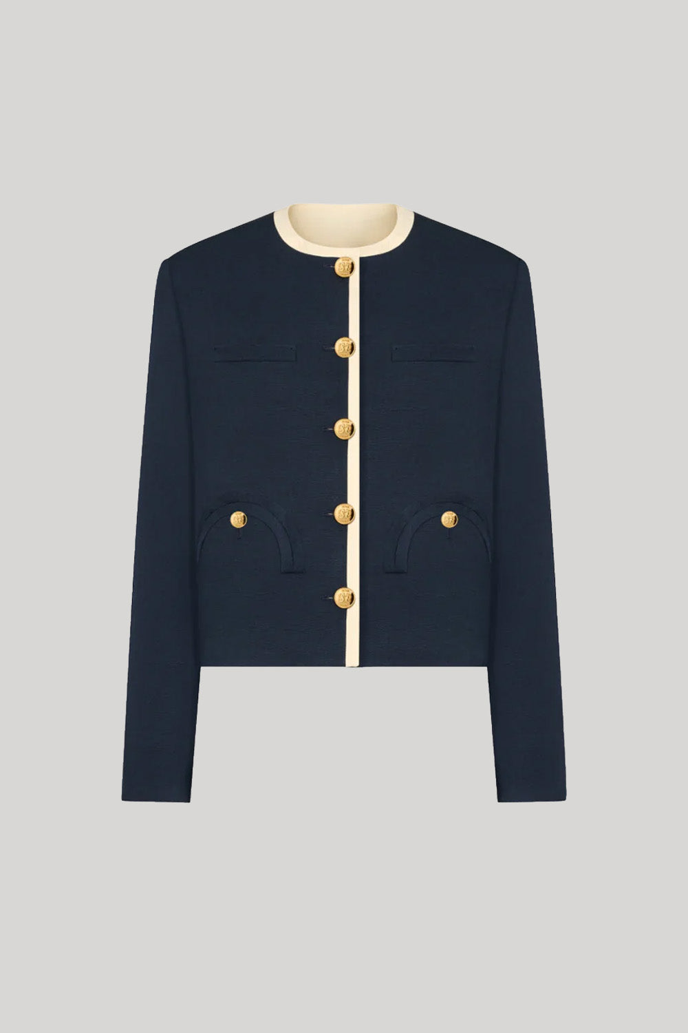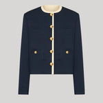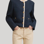 Timeless elegance defines the Genesis Shamo Bolero. Its graphic silhouette, deep midnight blue hue with cream trims, and gold-tone buttons give an enduring appeal. Style it with the coordinating Morelia Pants for a polished ensemble, or pair it with light-wash denim for a more playful twist.