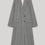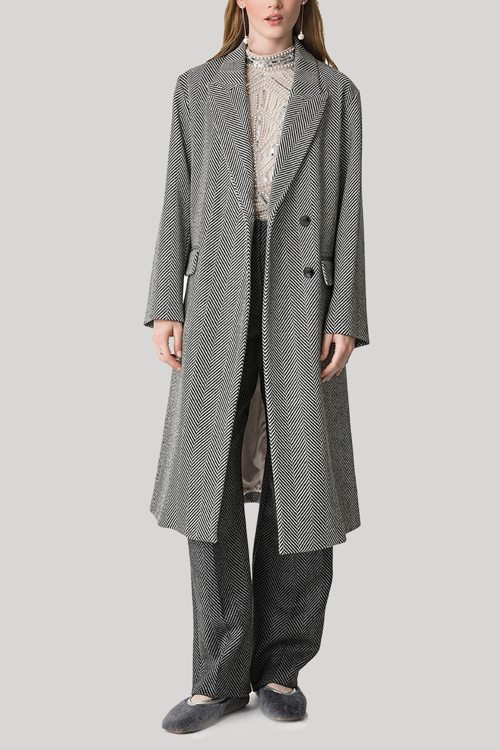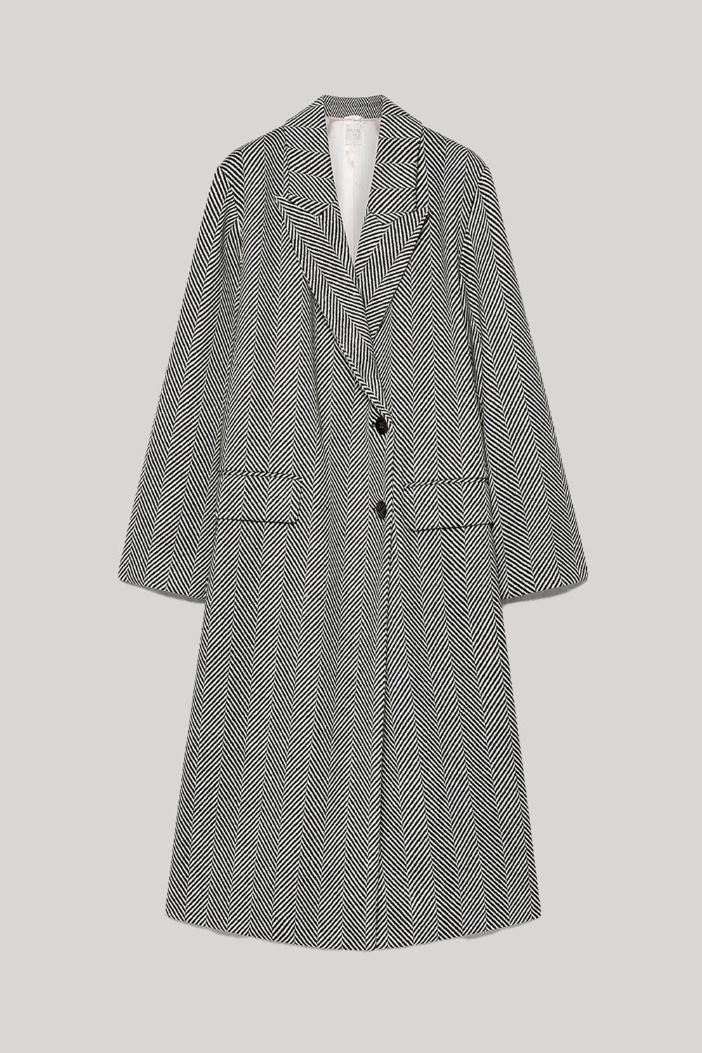 With a restrained feel and masculine construction, this chevron–patterned coat in pure wool taps into the legacy allure of a one–of–a–kind wardrobe gem that swathes you softly like a loving embrace. Falling straight down from the bust with a slightly dropped shoulder, the chevron–patterned coat has pointed lapels and front cut for a sleeker silhouette.
