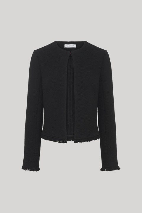 The Normand Jacket, crafted in basketweave wool coating, features a minimalist neck closure and an open-front silhouette, with raw-fringed edges at the sweep and cuffs for an elevated and raw finish.