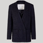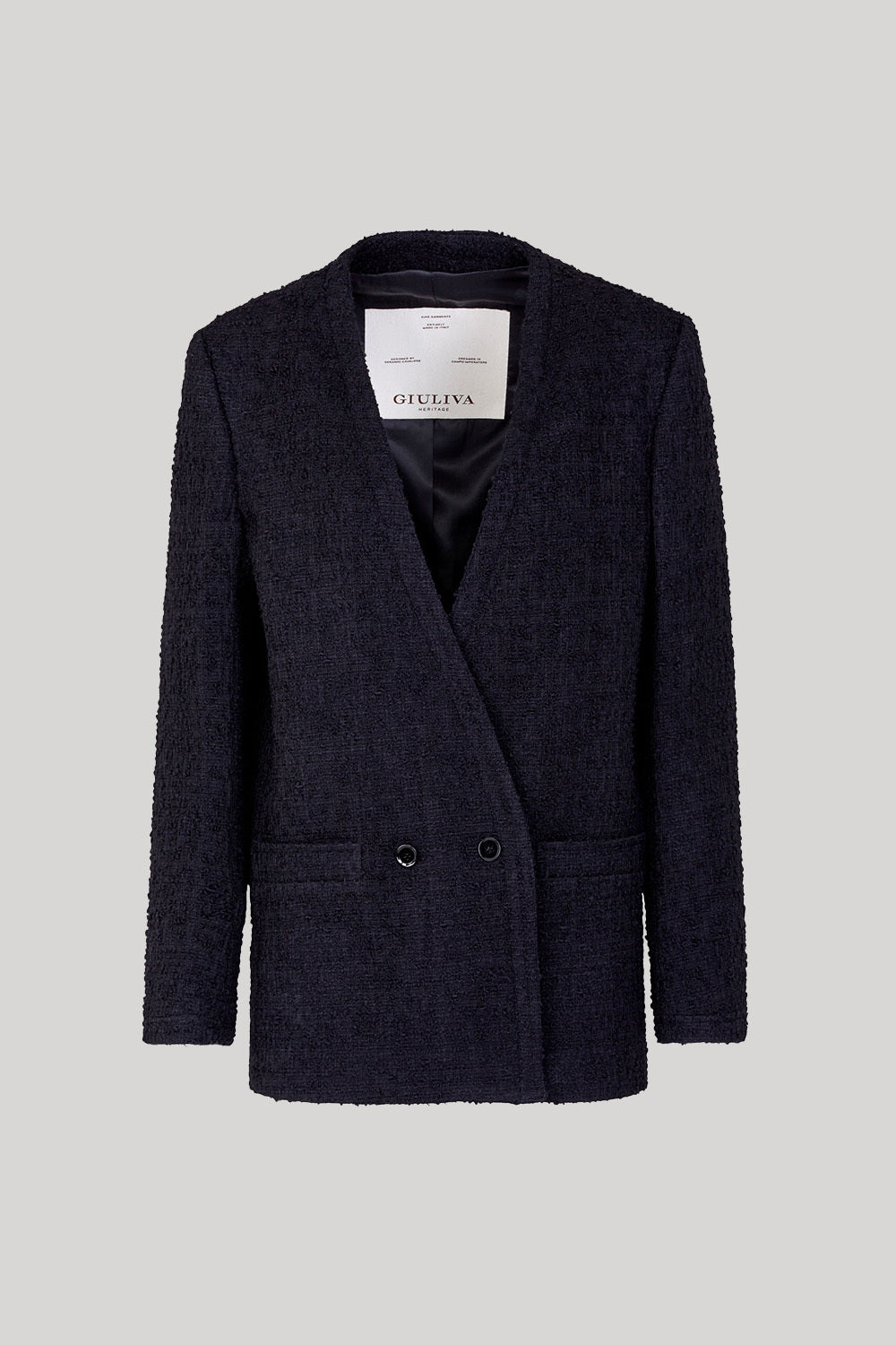Double-breasted jacket in rich black bouclé wool. The textured weave gives structure and depth to the minimal silhouette, offering a versatile layer that moves easily between day and night.