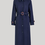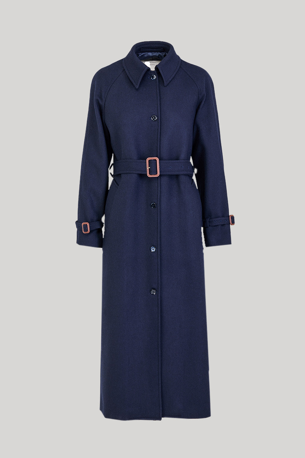 The Dust Coat is a full-length outerwear piece crafted from navy wool, designed to offer structure and warmth through the colder months. It features raglan sleeves, a pointed collar, and a front button closure. The matching belt and adjustable cuffs are detailed with covered buckles, adding a utilitarian note to its otherwise clean silhouette. A timeless, practical shape that layers easily over tailoring and dresses alike.