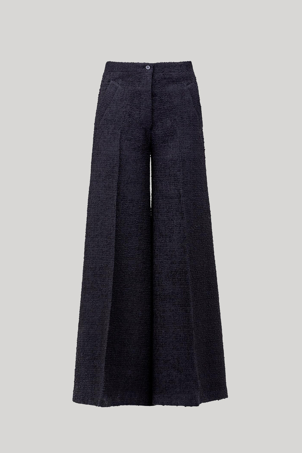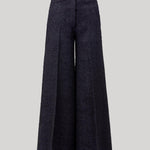 Tailored wide leg palazzo trousers in soft wool bouclé with pressed front crease, concealed front button closure and front pockets.