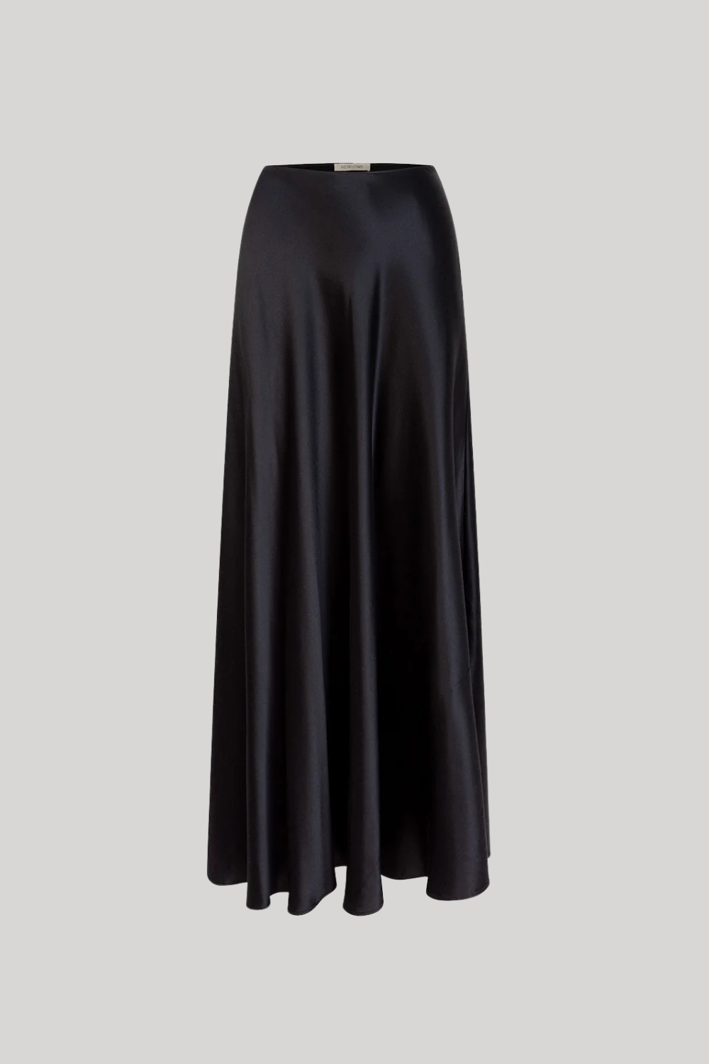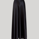Bias, floor length skirt in mid weight crepe-back silk satin fabric. Clean lines, and dramatic sweep, designed to style both for daytime and evening. Side seam zipper for closure.