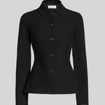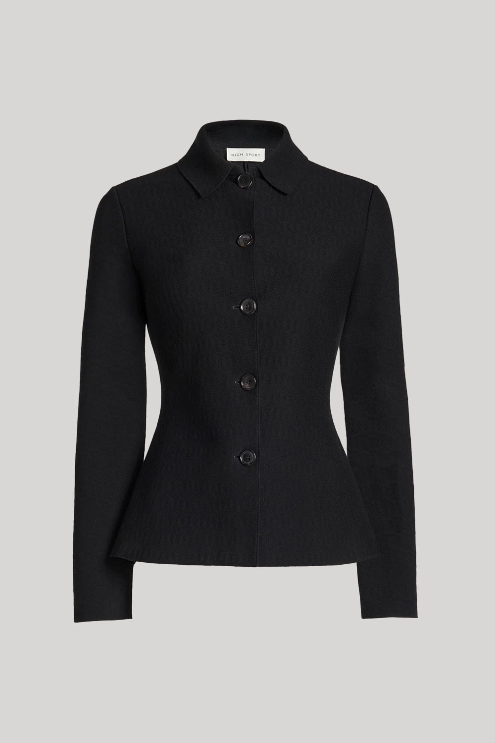 Lightweight, knit jacket with button-up placket and single-layer collar. The Oliver coordinates perfectly with our Kick and Louis Pants in black cotton, as well with the slinky viscose Gene pant, as shown. Knit in Italy from Italian cotton and French Lycra. Unlined.