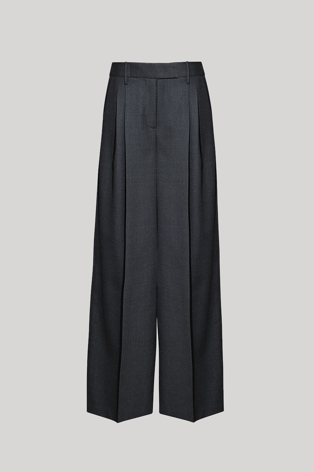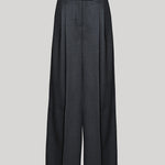 Low-rise pleated trouser with a relaxed yet refined fit, designed with an elongating double-pleated front. Impeccably tailored with side seam pockets, two buttoned back flap pockets, and a wide looped waistband with tab waist closure for a polished finish. Crafted in light wool suiting. Pair with a crisp button-down or classic knit for understated sophistication.
