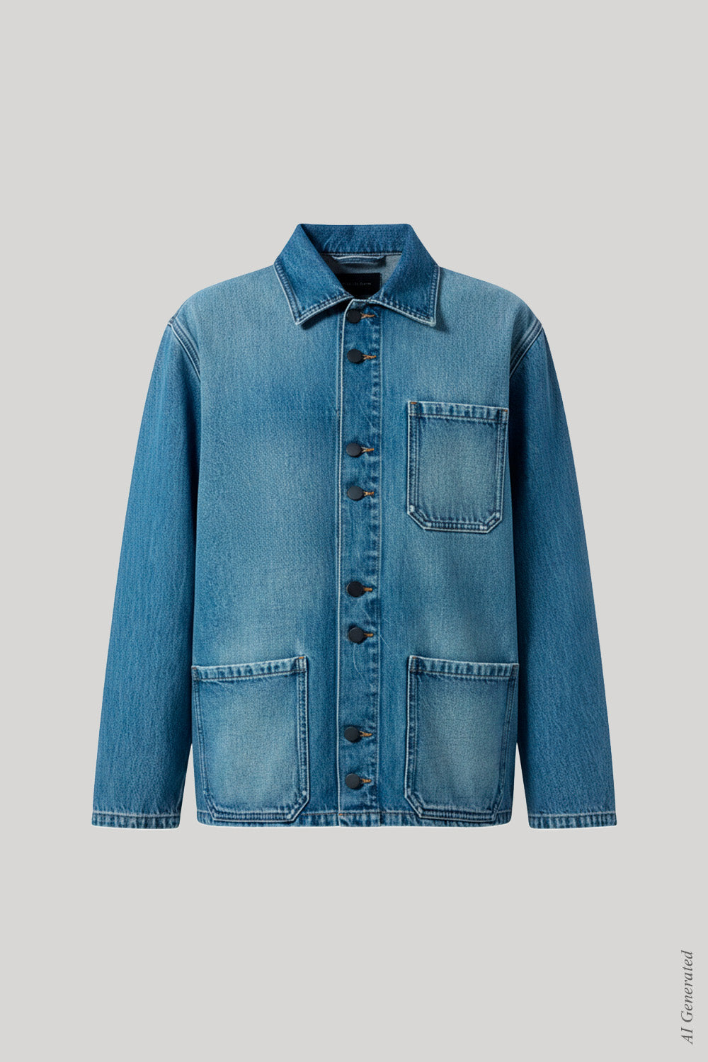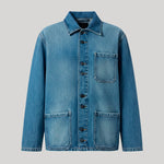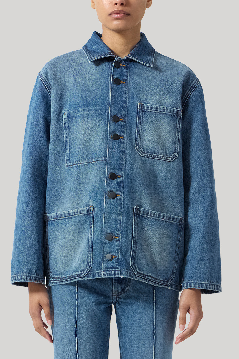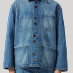 Vintage inspired denim chore jacket. Slightly oversized straight silhouette with thoughtful flat felled seam details. Features long sleeve with inner chest pocket, single front chest patch pocket, and two patch pockets at the hip. Coupled matte black shank buttons down the front placket.