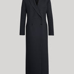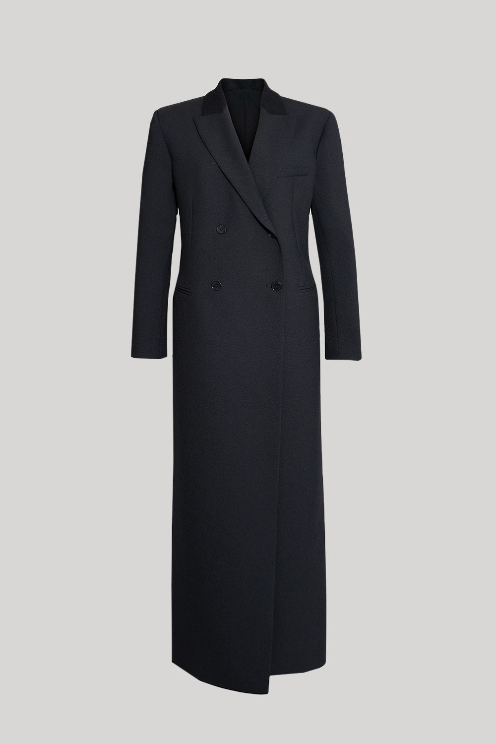 Double-breasted, heavy weight ankle-length blazer. Features four front buttons and relaxed and impeccably tailored straight silhouette. Long slim sleeves, darting at bodice, chest welt pockets, welt pockets at waist ,classic notched lapel and high back vent for ease of movement.