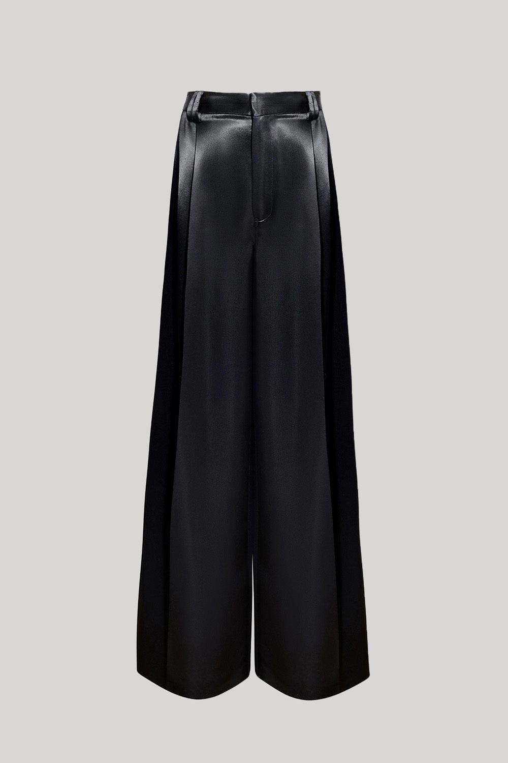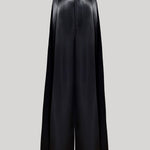 High-waisted pleated trouser with wide roomy lustrous liquid twill. Flattering and elongating fit with pleated silhouette and is impeccably tailored. Features back welt pockets, tab waist closure, and double front belt loops for added detail. Pair with slinky blouse or elevated knit and a elegant heel.