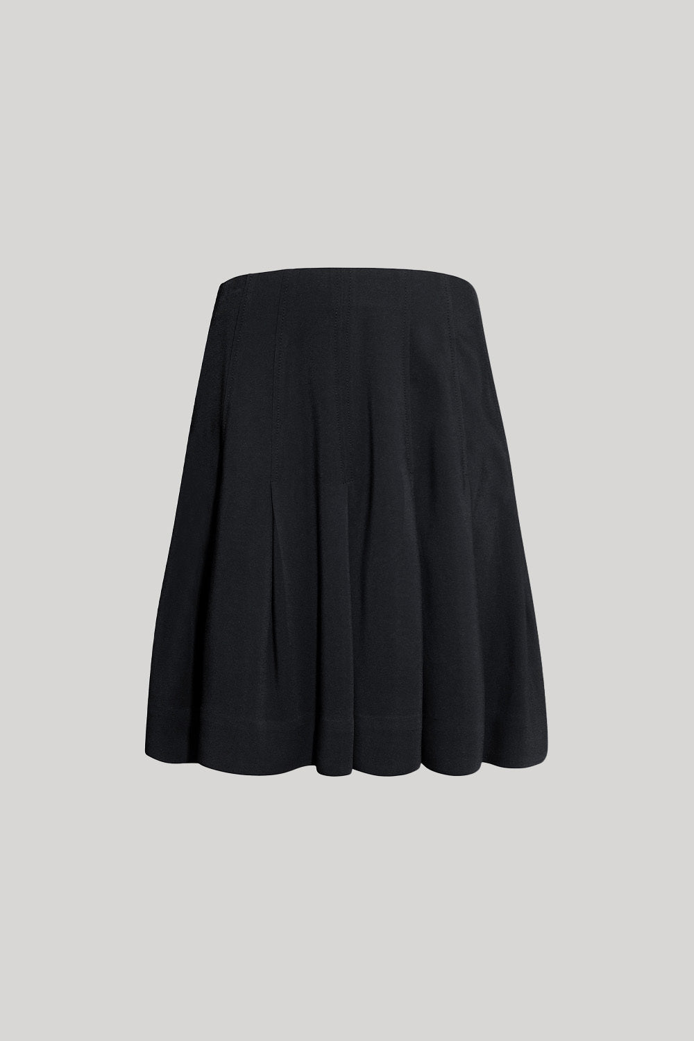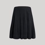 Voluminous, above-knee length skirt in black viscose. Designed to sit just below the natural waist. Features hidden pockets within the front pleats, offering both functionality and a modern, relaxed silhouette. The skirt is unlined and fastens with a side zip. Pair with the Naia Draped Top for an evening look, or wear with a Kenzie Tee and tailored jacket for elevated everyday wear.