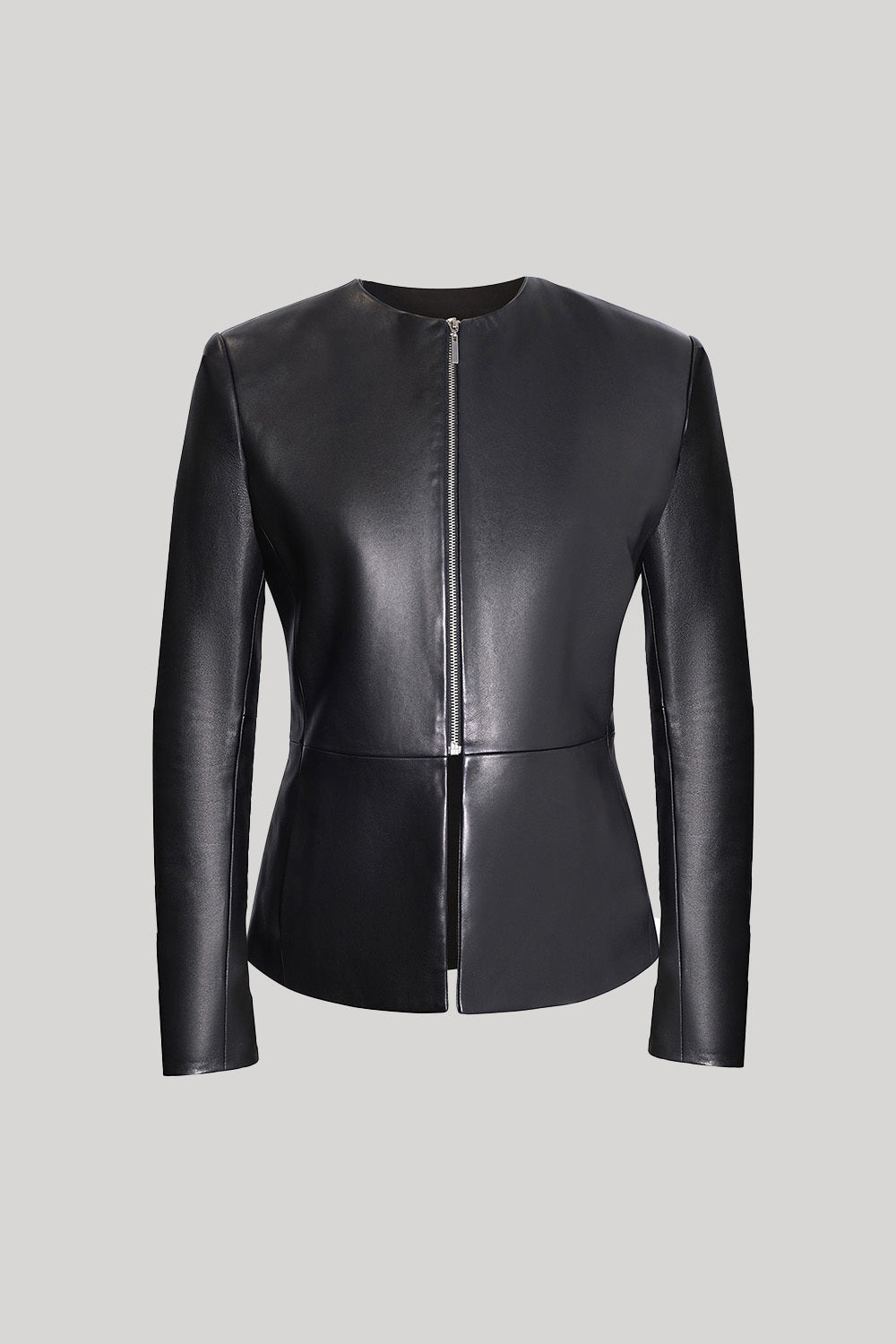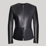 A sleek and modern jacket crafted in luxurious black leather. Features a clean collarless design with fitted silhouette and full length sleeves. Front zip closure creates streamlined styling while the peplum hem adds feminine shape and movement. Tailored construction ensures a flattering fit. Perfect for elevating any look.