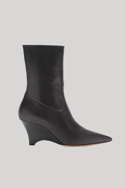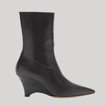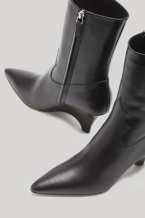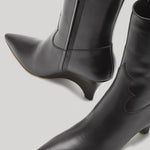 Camille Tall Boot, handcrafted in black leather, with a pointy toe, cushioned calf leather insole and zip fastening. 70mm heel.