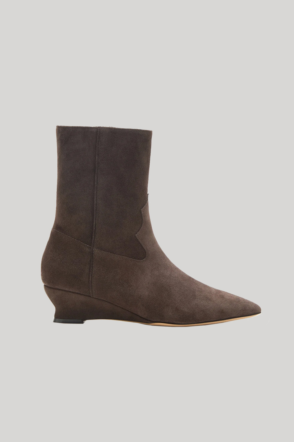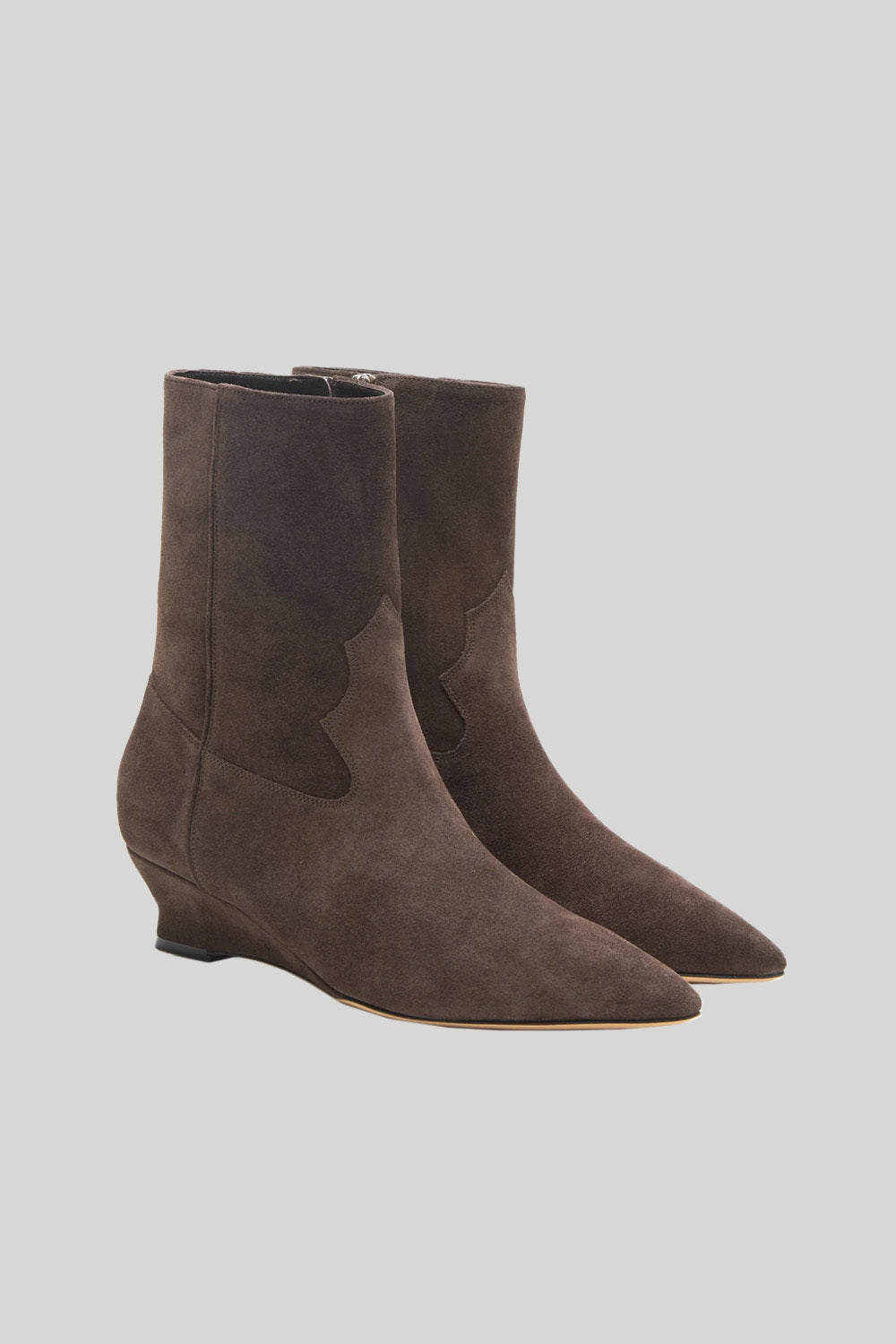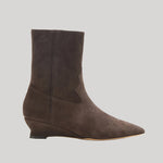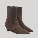Camille Boot, handcrafted in pepper suede, with a pointy toe, cushioned calf leather insole and zip fastening. 40mm heel.