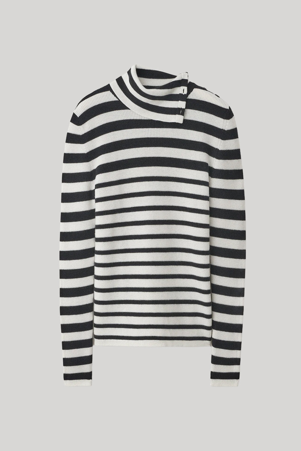 An asymmetric silhouette, the Sabrine sweater is crafted in our ribbed jersey-like cotton cashmere composition. The regular fit, hip-length silhouette features a high neck detailed with buttons, full-length sleeves and a clean hem.