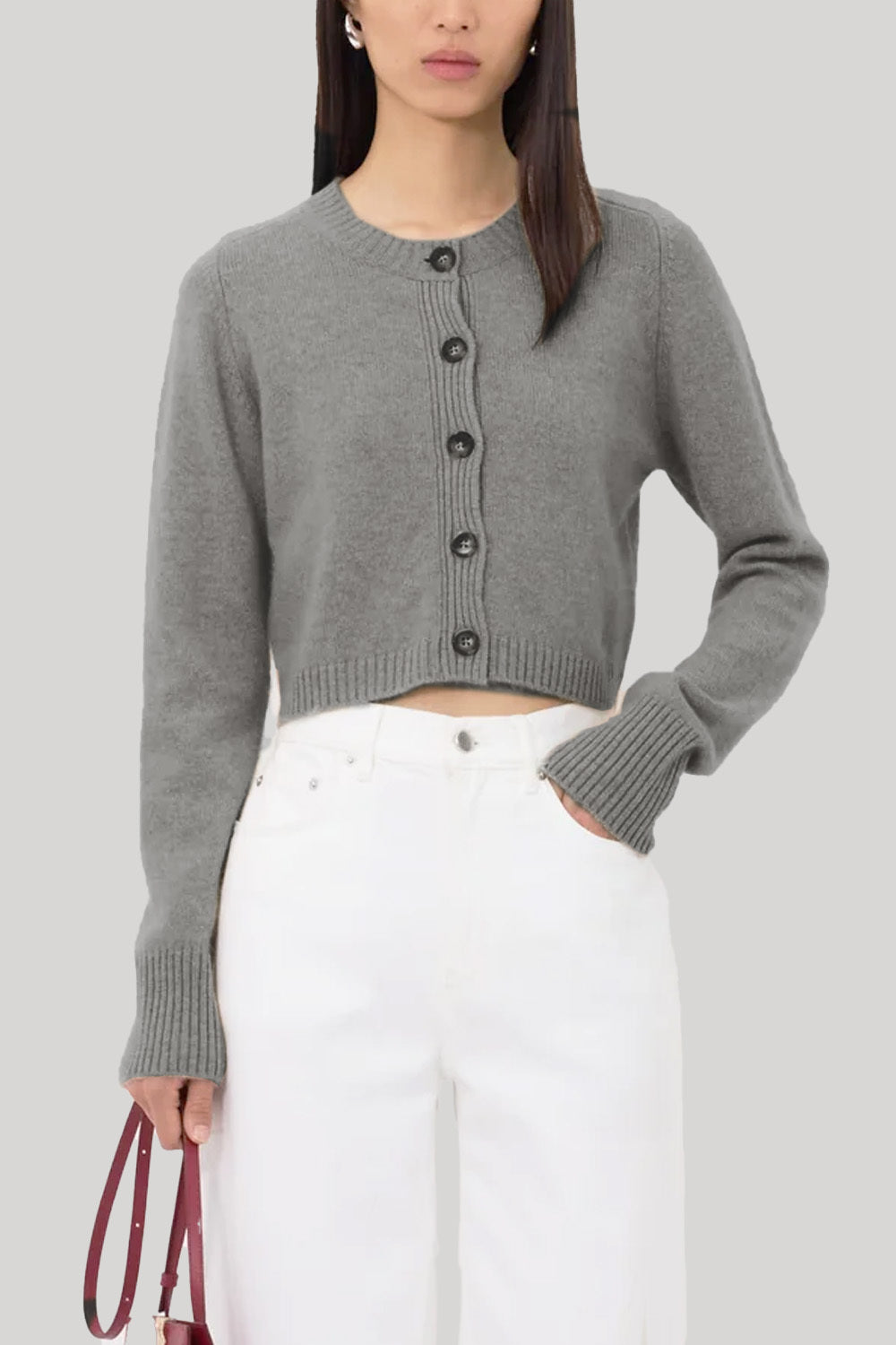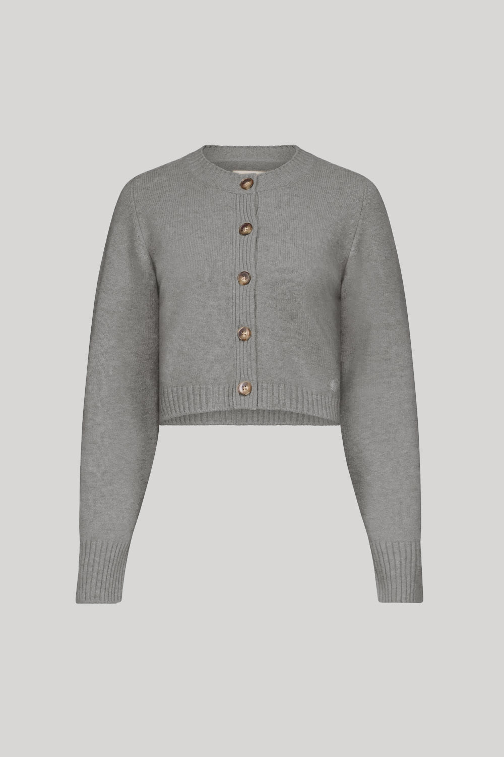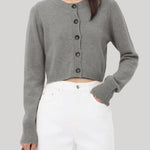 This cardigan is made of cashmere. Its cropped, fitted silhouette contrasts with long sleeves that create a feminine allure. Details include a ribbed crew neck, hem and cuffs and a five button front.
