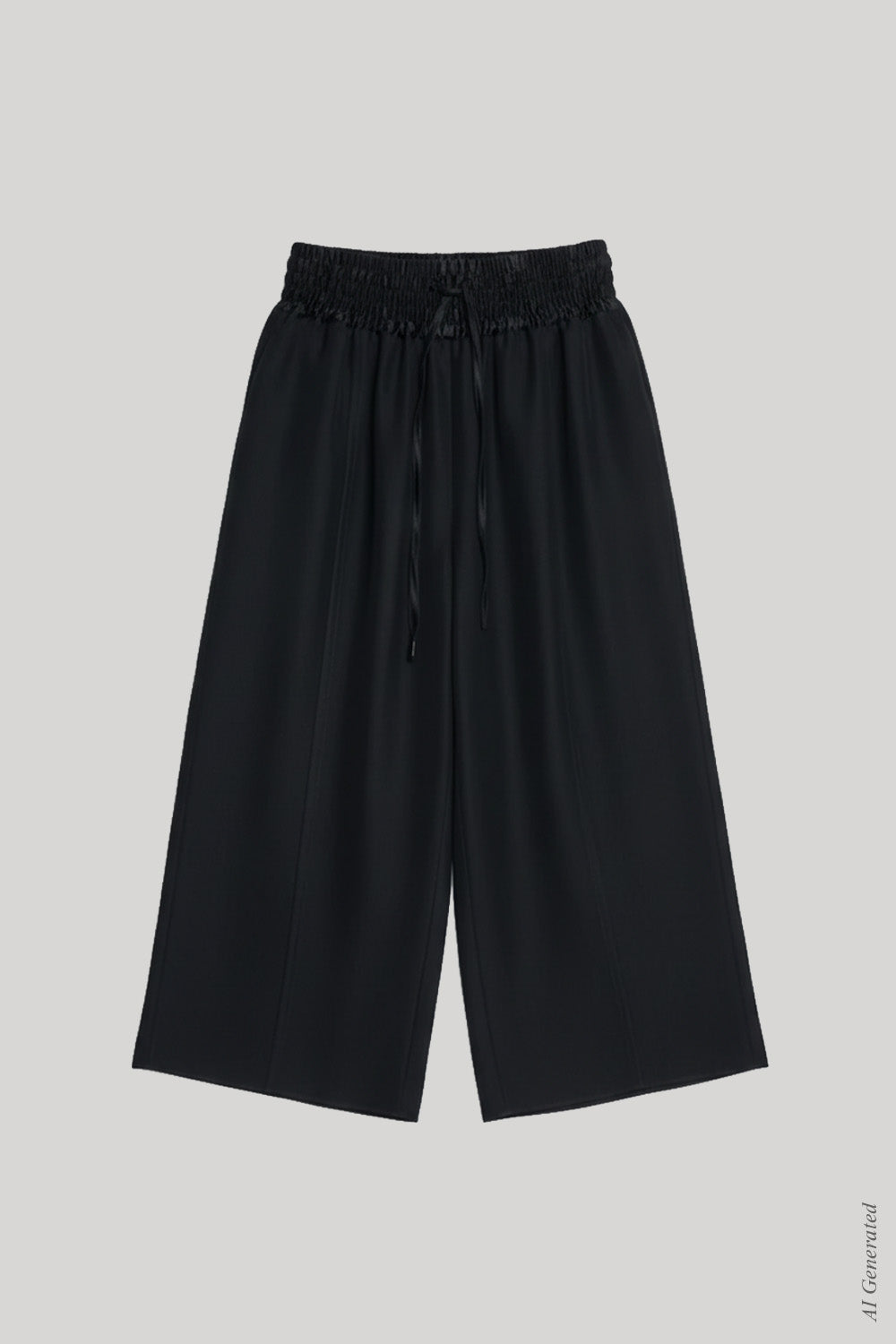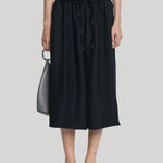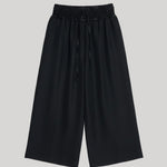 The Basketball Culotte in black Naia Renew Sateen has a wide leg, side pockets, and a smocked drawstring waistband. Can be worn with a white t-shirt and flip flops or dressed up with your favorite pair of heels.