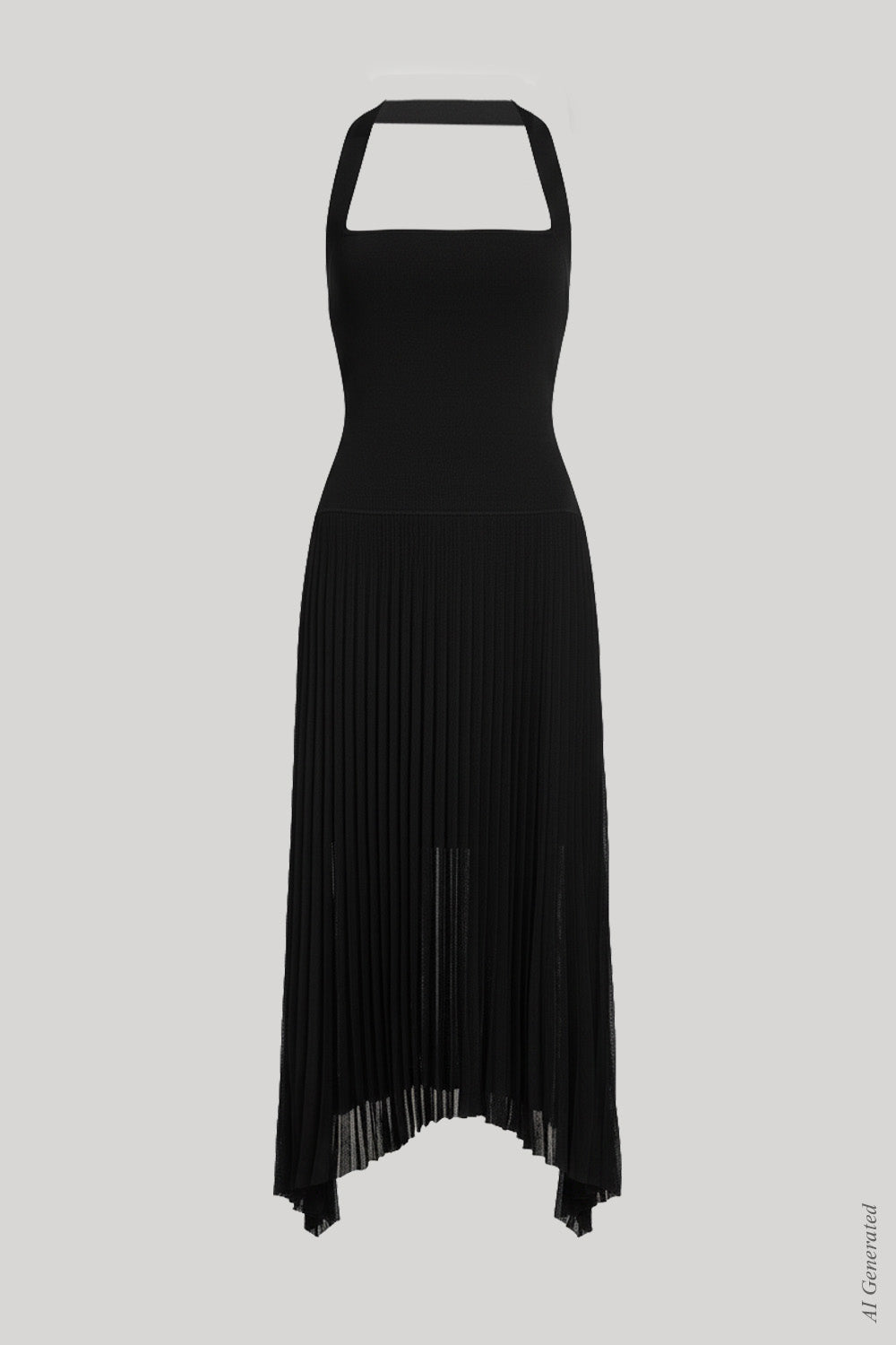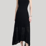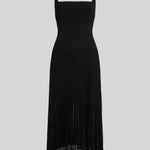 The Halter Pleat Dress in black is knit in an FSC stretch viscose with a flowy, midi length, pleated, sheer skirt, fitted bodice and halter strap around the neck. The waist is slightly dropped with a shorter lining to highlight the sheerness of the skirt.