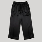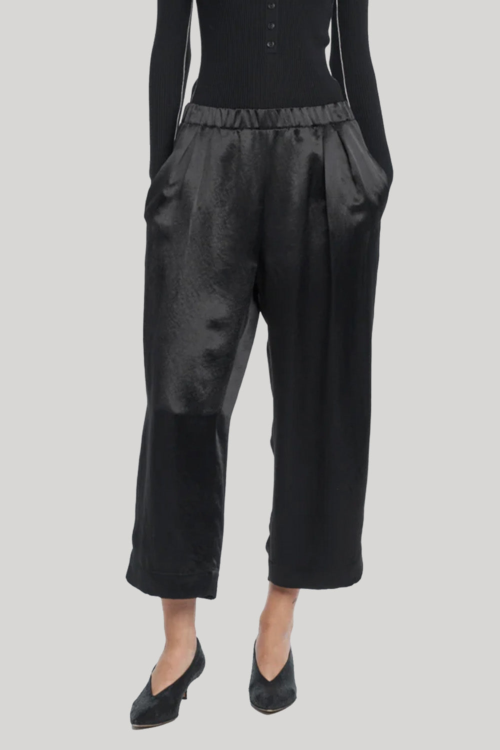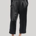 Our Pull On Wide Leg Crop is a new style and easy addition to the everyday wardrobe. Made in a black Naia rene sateen, the trousers have and elasticted waistband, a wide leg shape cropped at the ankle, feauture hidden pockets. With a satin finish, these trousers can be styled for a more elevative look.