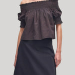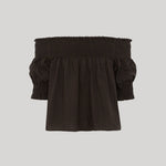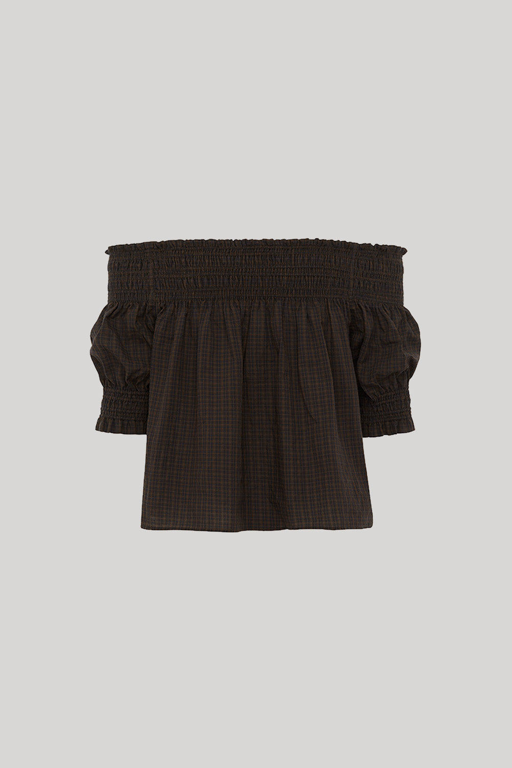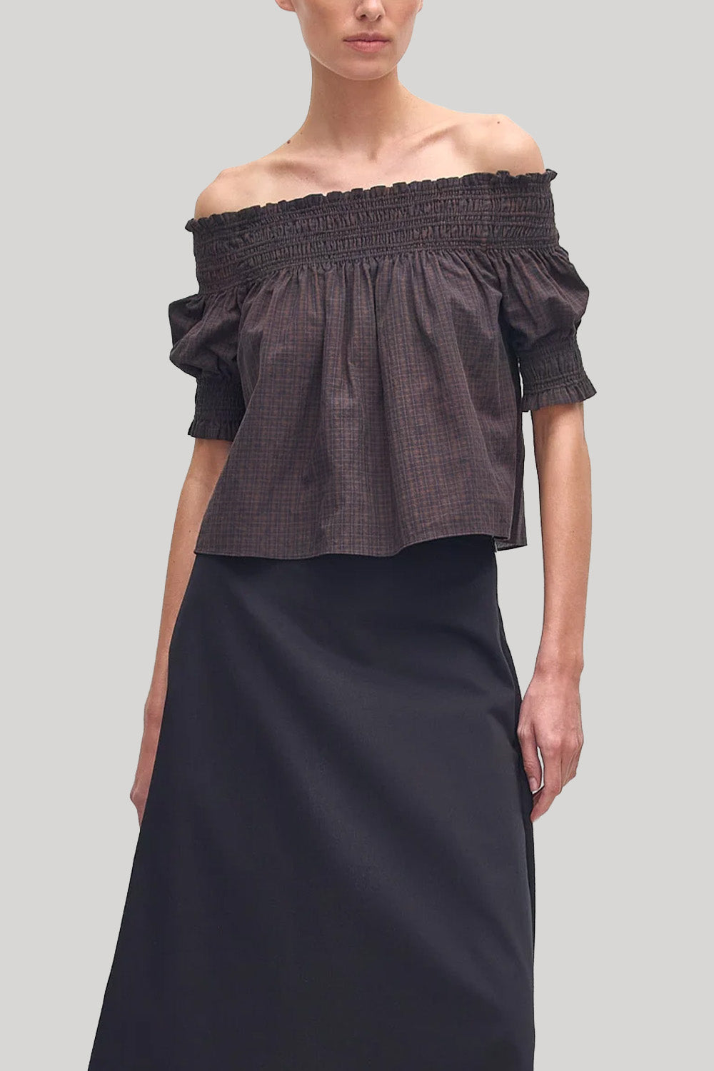 Introducing the Shirred Off Shoulder Blouse in Nantucket Check. This easy to wear blouse is crafted in a textured cotton micro-check and features a classic shirred elastic at the neckline and sleeve for a flattering silhouette. Style with an A-Line Skirt for an elevated everyday look, or with the Relaxed Jean for a more casual approach.