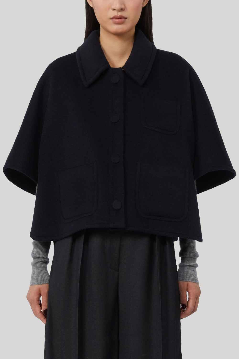Boxy-fit short cape.