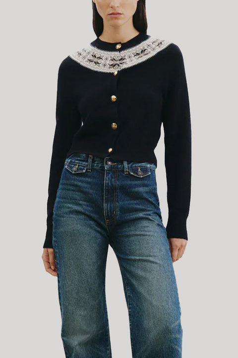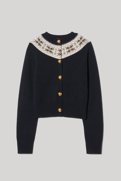 Long sleeve cardigan in cashmere. Medium weight in jersey stitch with jacquard fair isle pattern. Slim fit. Medium body length. Regular length raglan sleeve. 1x1 rib at cuff and hem. 1x1 rib double layer neck trim. Grosgrain at center front placket with gold crest button closure. Jacquard fair isle pattern. Fashioning at armhole and sleeve.