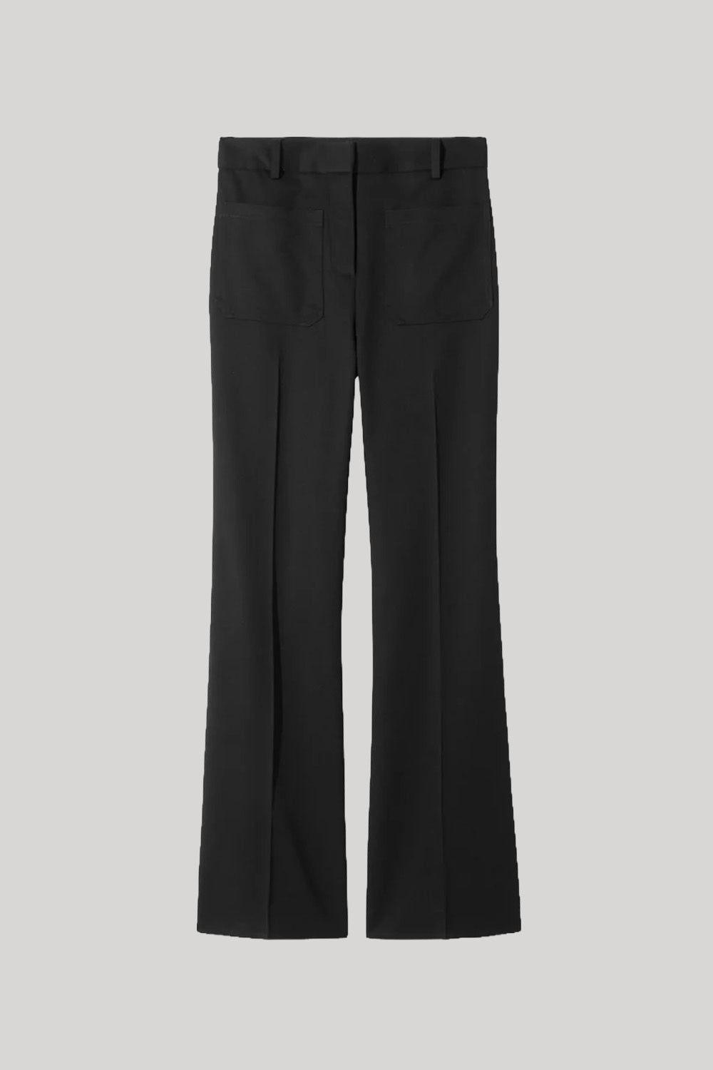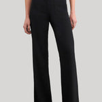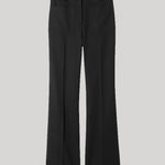 Flat front, high waist straight leg pant in Italian non-stretch wool. Slight flare at hem. Front and back patch pockets. Zip fly. Hook-and-bar closure. Belt loops.