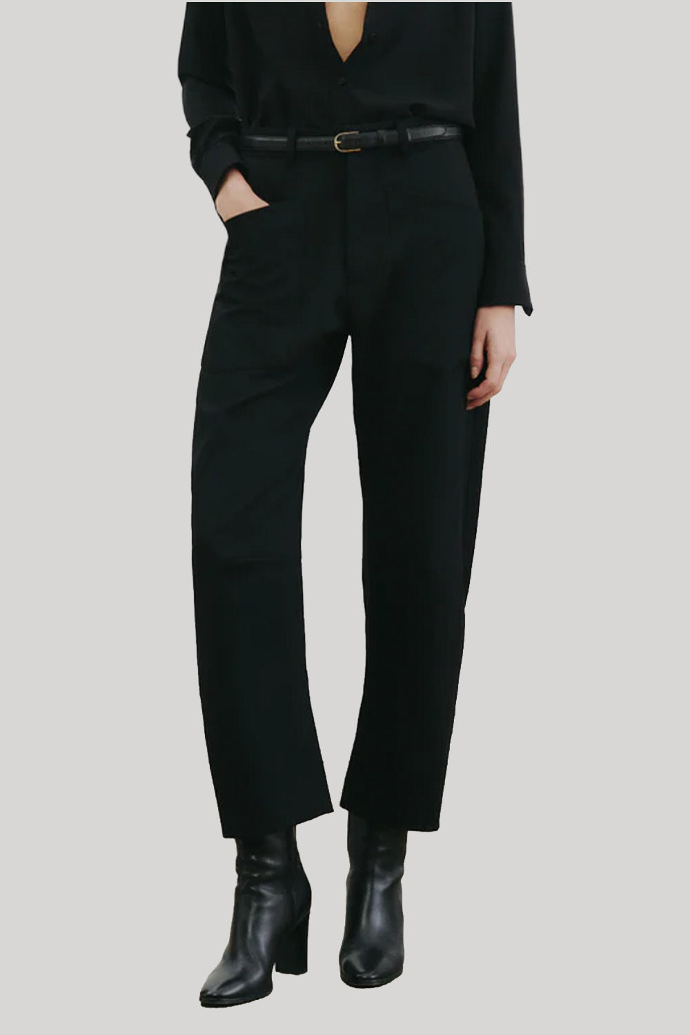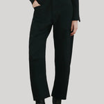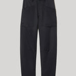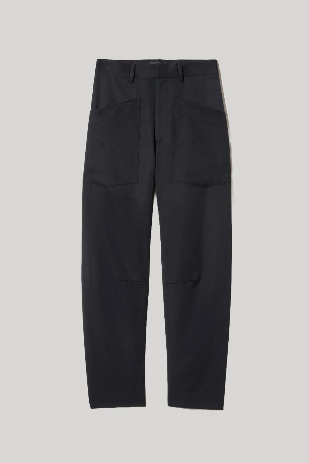 Mid-rise, relaxed fit barrel leg pant. Uniquely curved silhouette. Seam detail at knees. Gusset at inseam. Zip fly. Hidden hook-and-bar closure. Hidden stay button closure. Top-stitched front and back patch pockets. Belt loops.