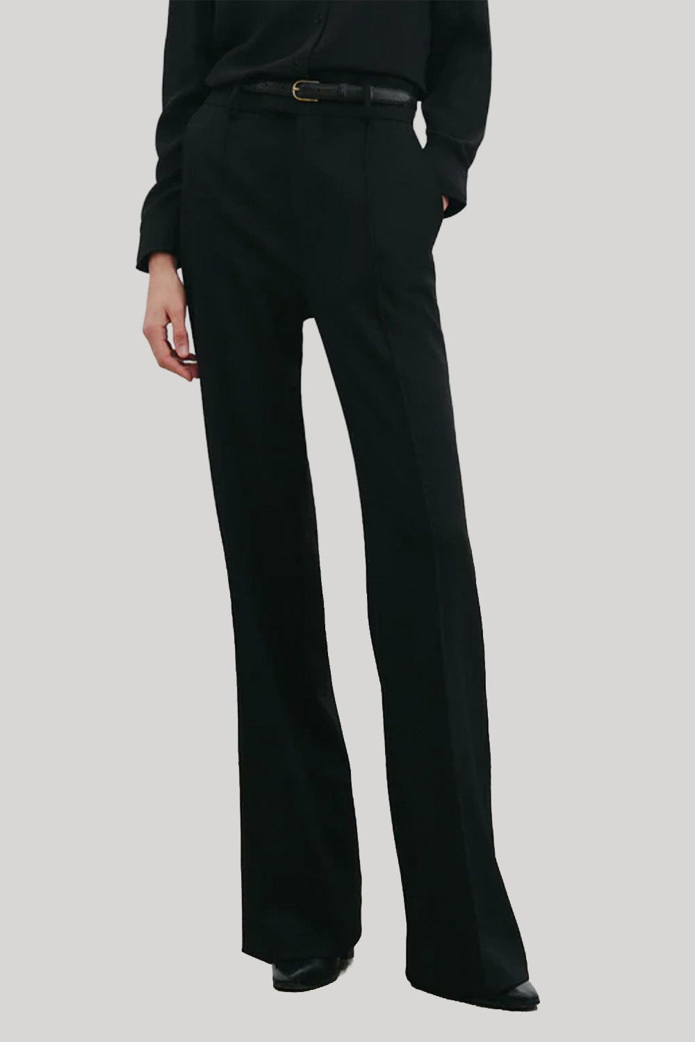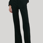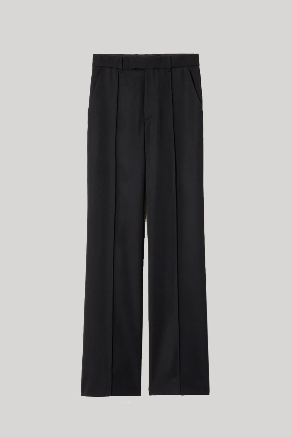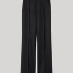 Mid-rise pant with relaxed leg. Extended waistband with curtaining, interior button, and hook-and-eye closure. Pin tuck stitched seam down front and back. Slant pockets. Back welt pockets with button closures. Belt loops.