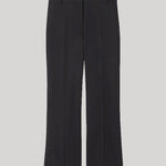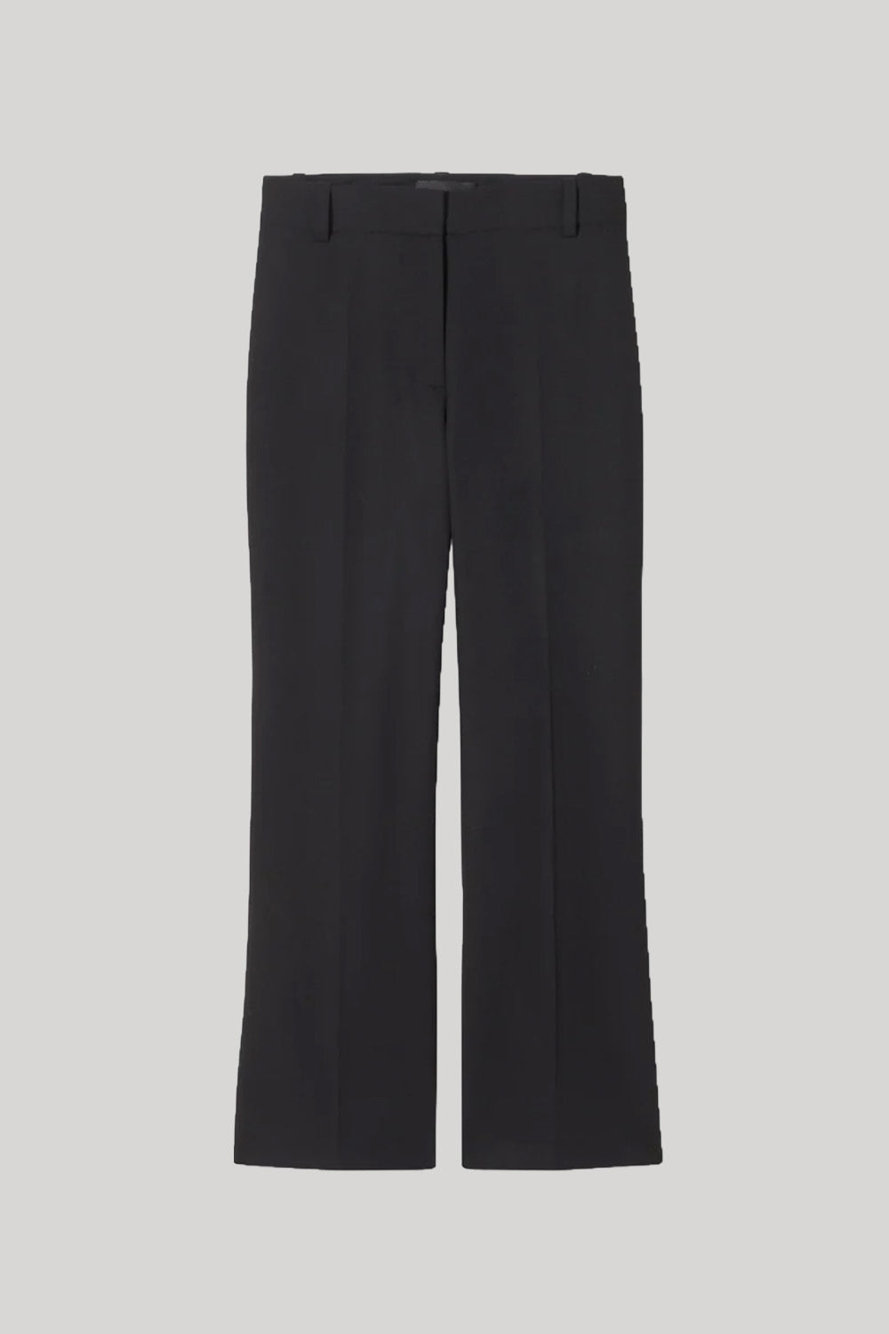 Flat front, high-rise straight leg cropped trouser in Italian non-stretch wool. Fitted through hips. Zip fly. Hidden hook-and-bar closure. Hidden stay button closure. Belt loops. Back welt pockets.
