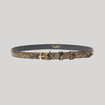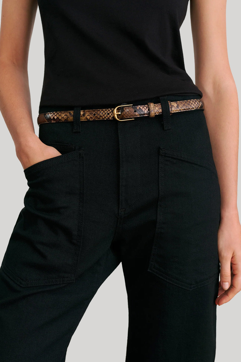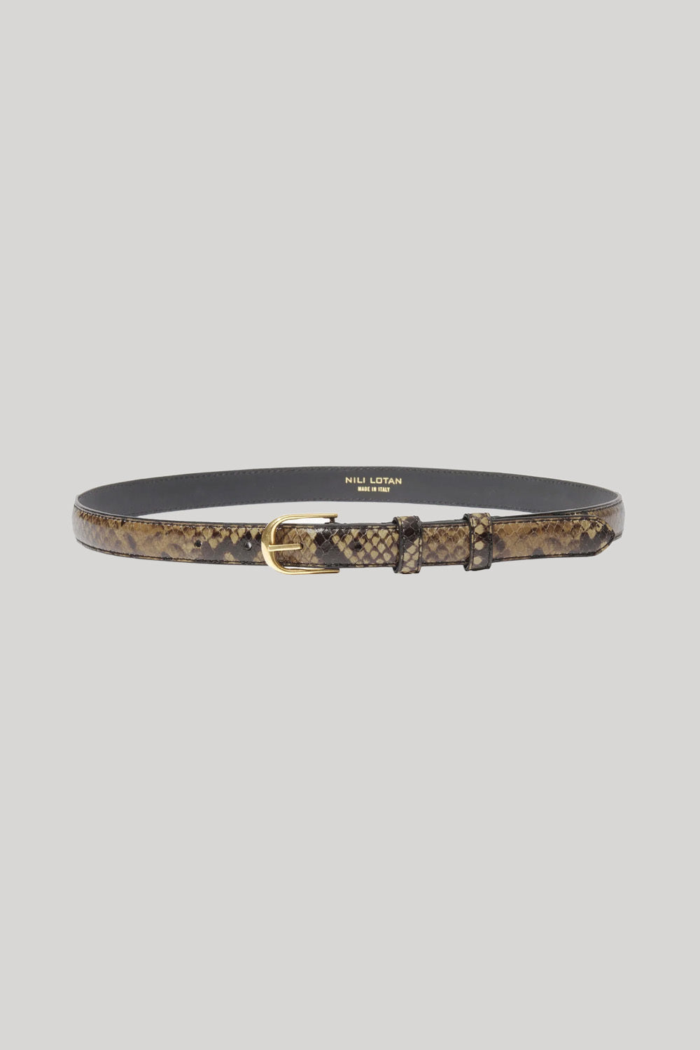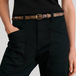 A narrow 3/4" belt inspired by Nili’s personal favorite vintage belt, featuring a solid brass buckle with special plating to look like polished brass. Croc embossed calfskin, made in Italy.