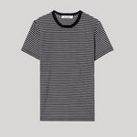 Straight fit short sleeve tee shirt in Japanese striped cotton jersey. Vintage pitch short sleeve. Self-binding along neck and shoulder.
