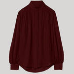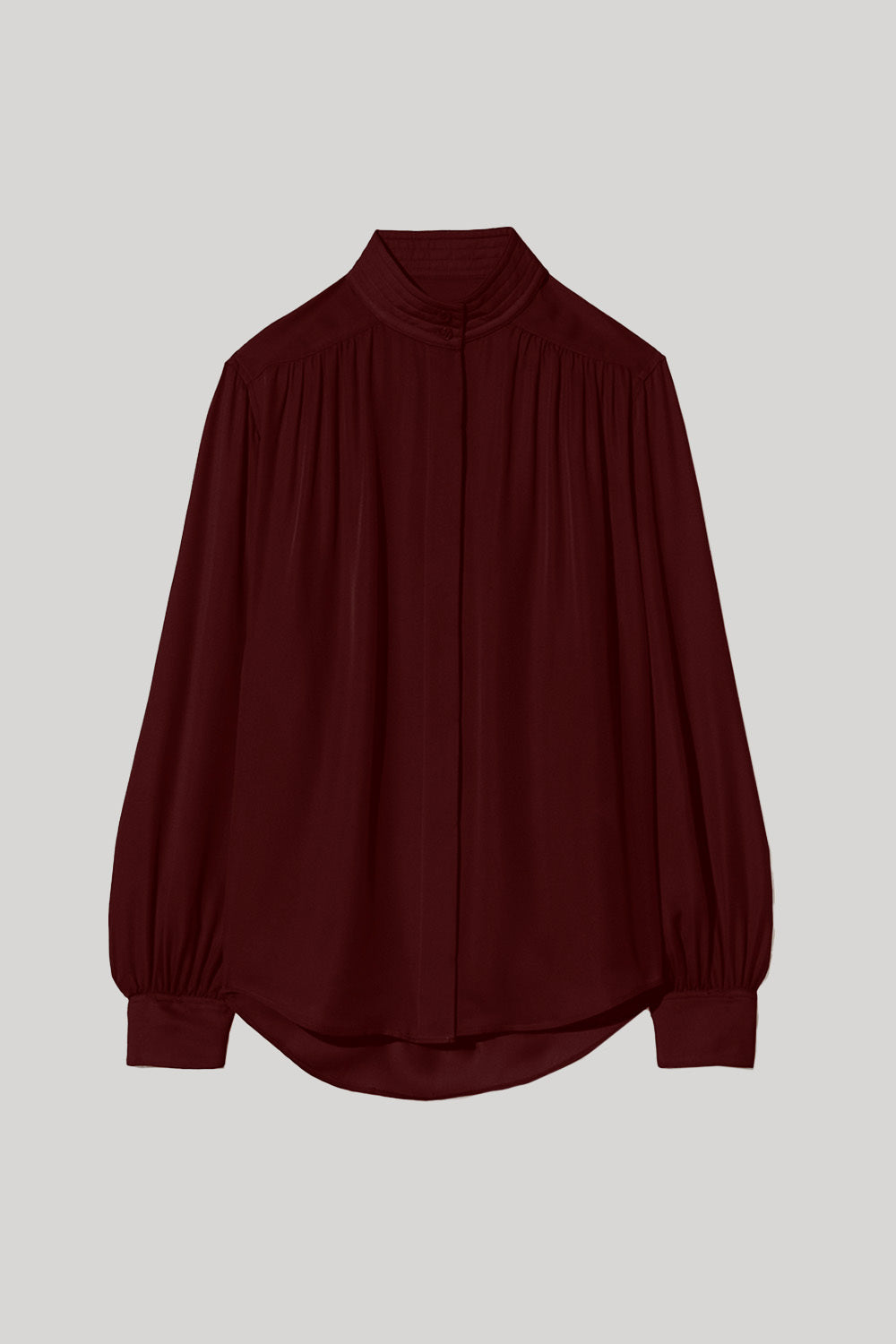 Relaxed fit blouse. Collar stand featuring tropunto topstitching. Hidden center front placket. Front yoke and sleeves with shirring. Billowy sleeves with buttoned cuffs and slits. Self-binding detail. Shirttail hem.