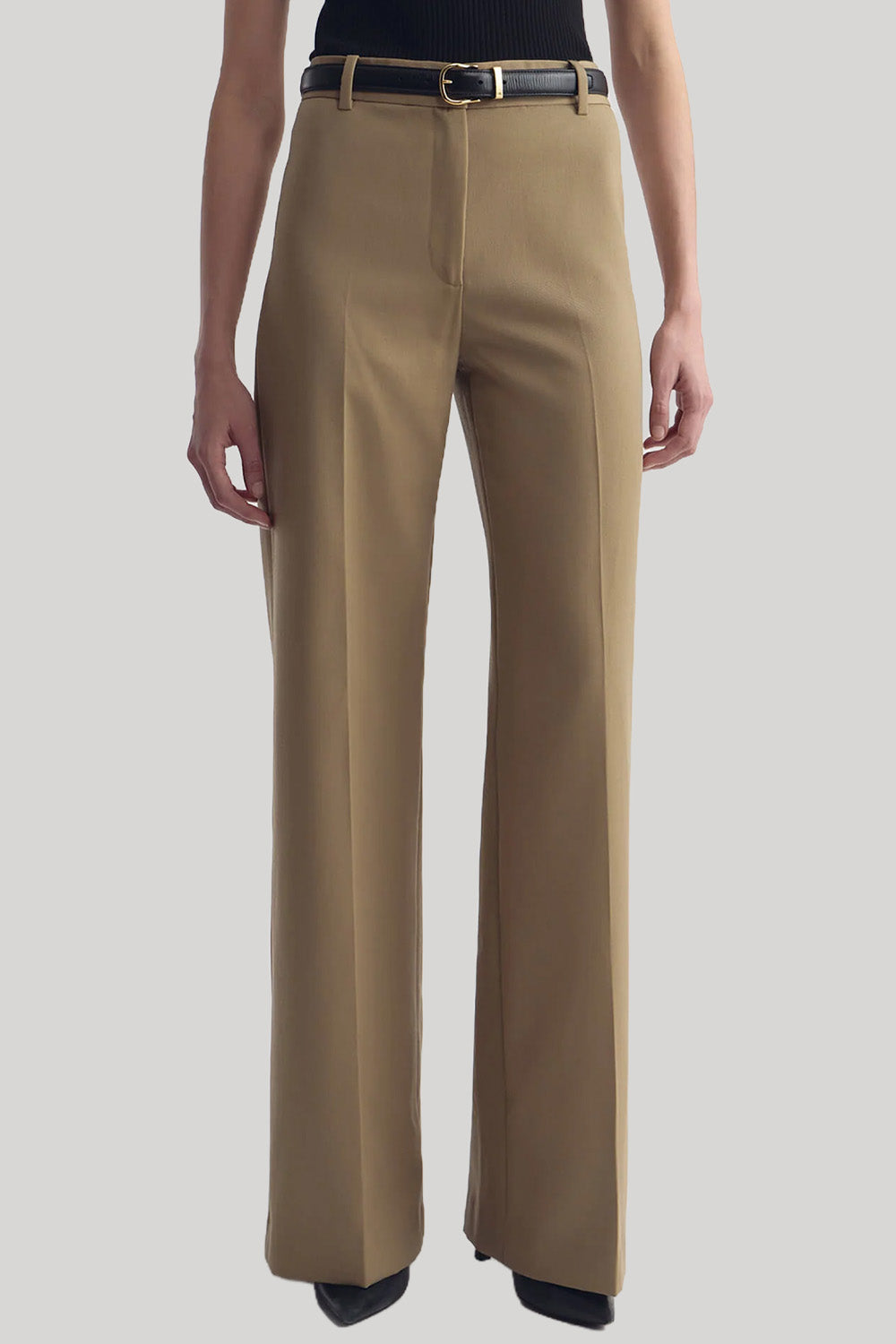 High-rise pant relaxed through the thigh and hip. Belt loops at waistband. Back welt pockets.