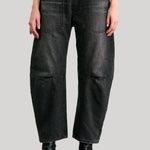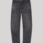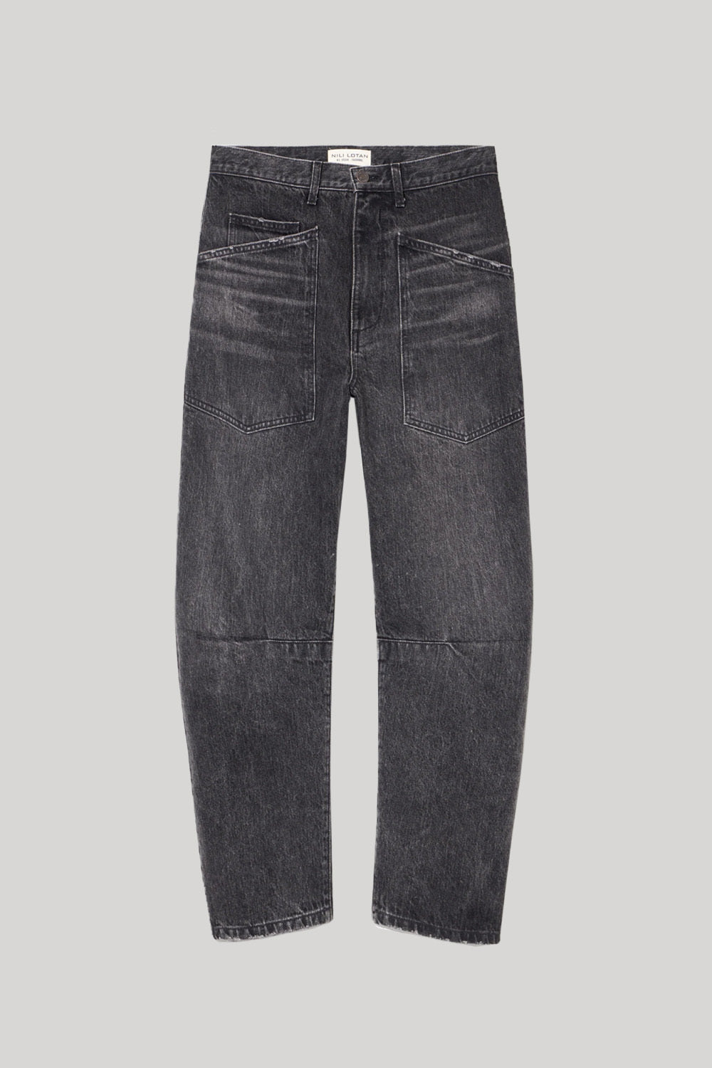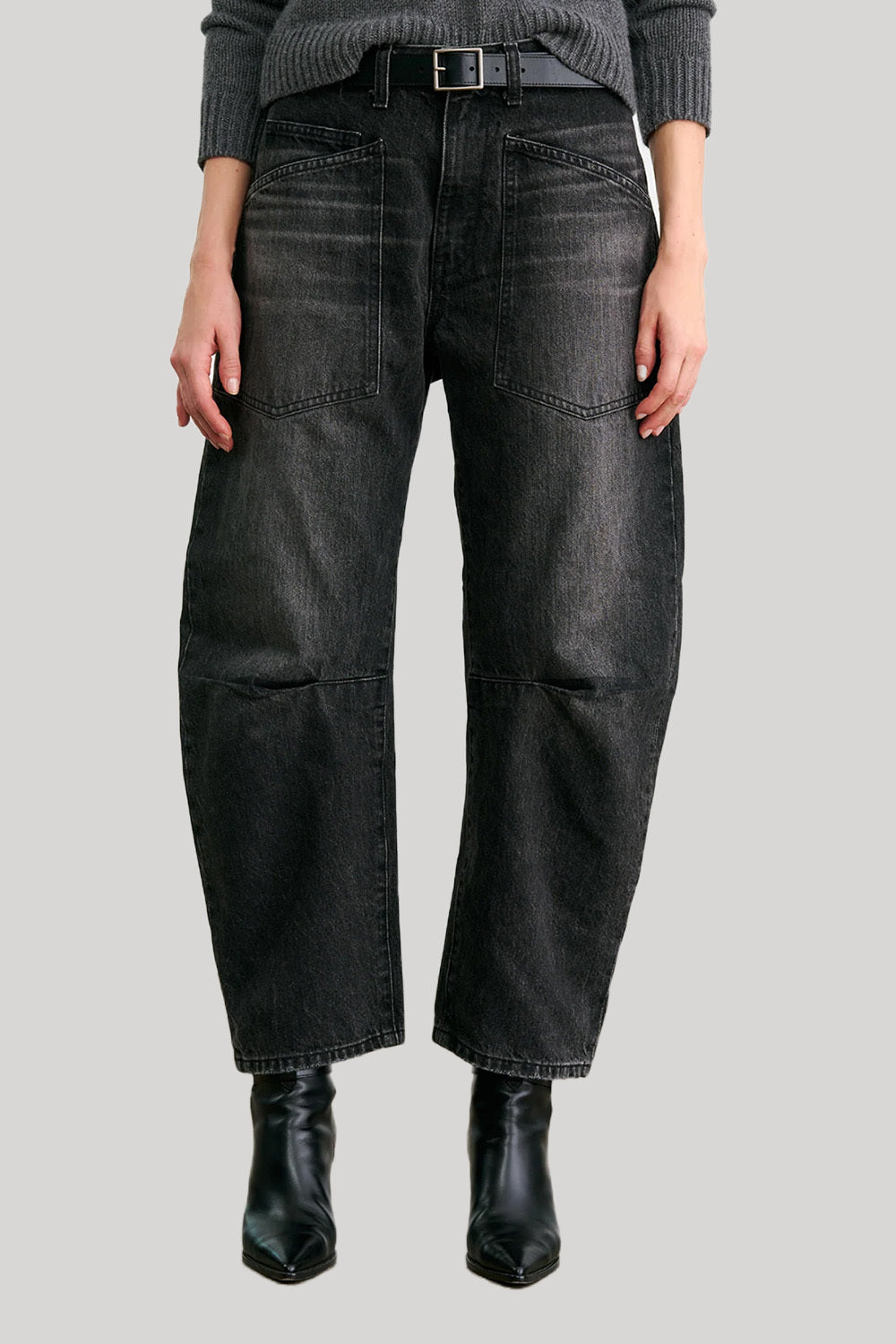 Mid-rise, relaxed fit barrel leg jean. Uniquely curved silhouette. Seam detail at knees. Gusset at inseam. Zip fly. Shank closure. Top-stitched front and back patch pockets. Belt loops.