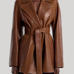 A belted jacket in polished leather with fluid drape. Defined by wide lapels, relaxed sleeves, and a self-tie belt. An elevated essential that captures effortless confidence and modern ease.
