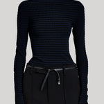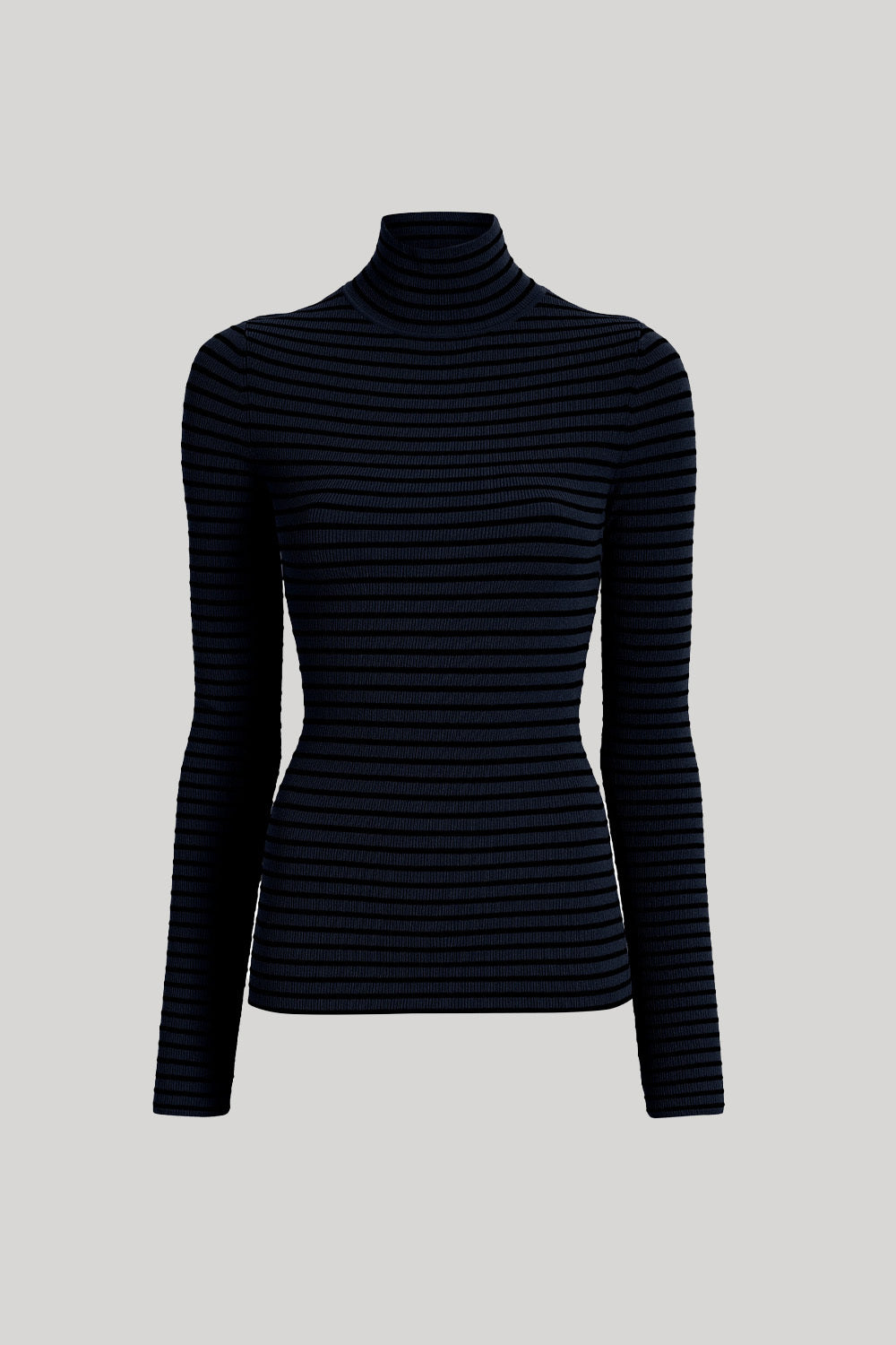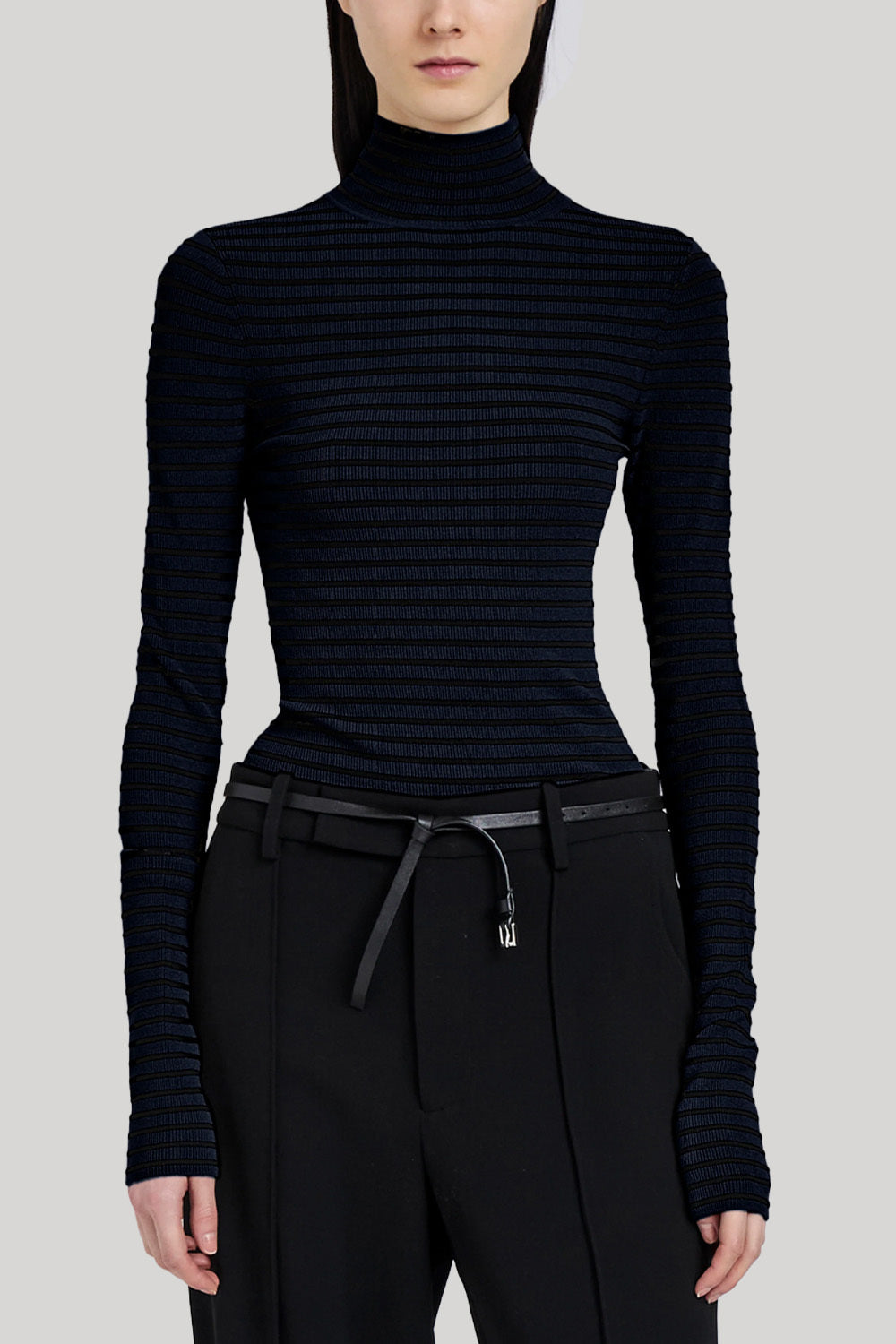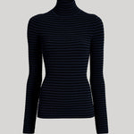 The Didi Top in Matte Viscose Velvet Stripe is knitted to a slim silhouette with a turtleneck, while alternating textural velvet stripes add subtle dimension.