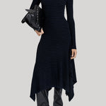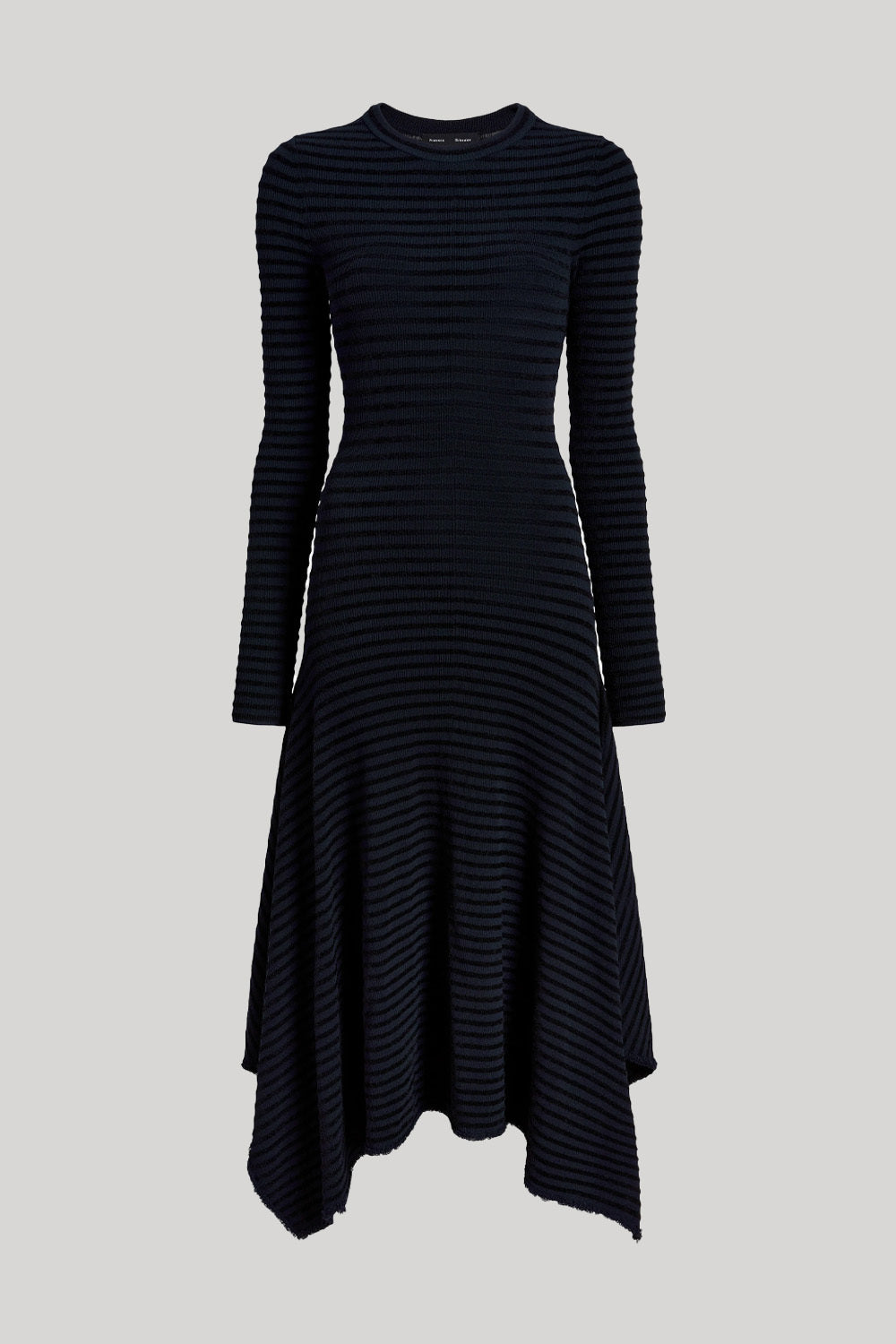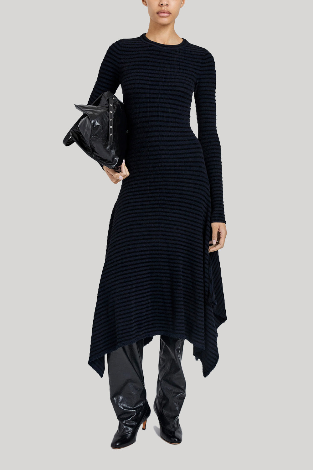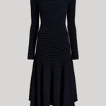 The Didi Dress in Matte Viscose Velvet Stripe is knitted to a slim silhouette with a crew neckline and finished with an asymmetric hem. Alternating textural velvet stripes add subtle dimension.