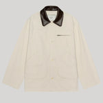 Our take on a heritage New England-style workwear jacket, designed with a relaxed fit. It features utility pockets, pleated vents at the back, and is made from garment-dyed cotton canvas. The contrast collar is crafted from genuine leather, and the jacket is finished with corozo buttons at the front placket and cuffs.