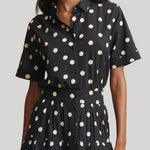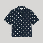 The Messenger Top features a boxy fit with straight-cut sleeves and a sharp collar, detailed with clean piping throughout and finished with classic shirting buttons at the placket. Cut from lightweight cotton with soft texture, printed in the season’s Polka Dot—playful, graphic, and timeless.
