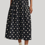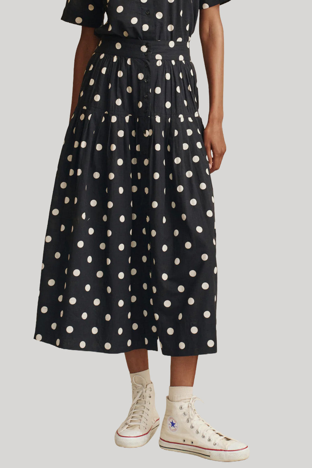 The Highland Skirt is cutfrom the season’s playful and classic Polka Dot Print on a lightweight cotton with a bit of texture, which brings gorgeous drape to this traditional shape. It has an elasticated waist for maximum comfort, a dropped waist seam, and shirting buttons down the front. It is finished with a flowy hem that hits just above the ankle.