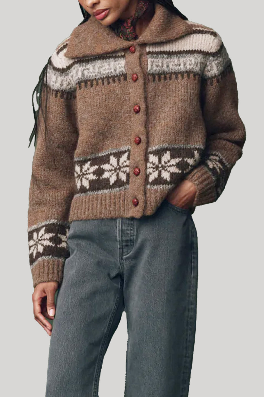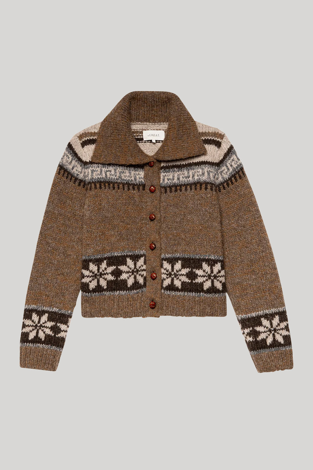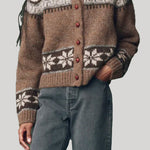 Knit from a soft alpaca blend yarn, The Nordic Scholar Cardigan features a classic Fair Isle motif with a mix of Greek key and floral patterns. Designed with an oversized collar, raglan sleeves, and ribbed cuffs and hem, it’s finished with a row of real leather buttons down the front. The fit is relaxed with thoughtful proportions and a subtle nod to traditional knitwear.