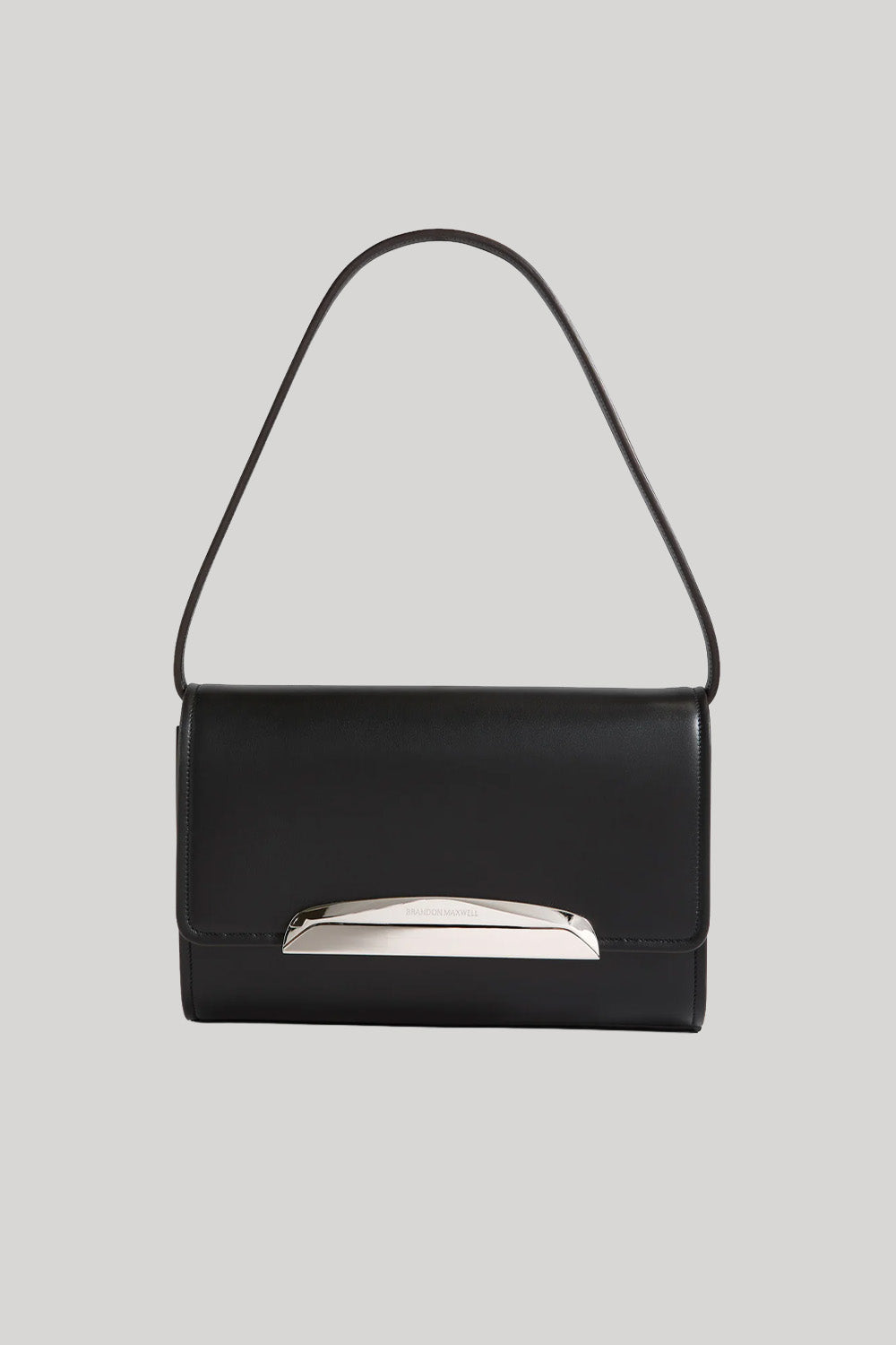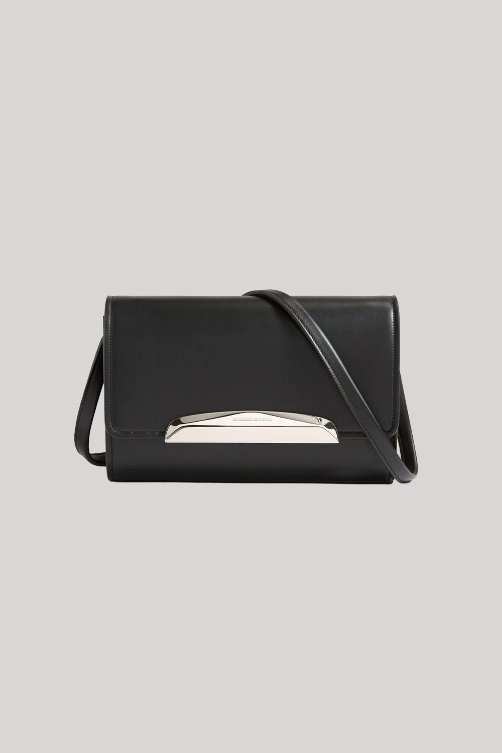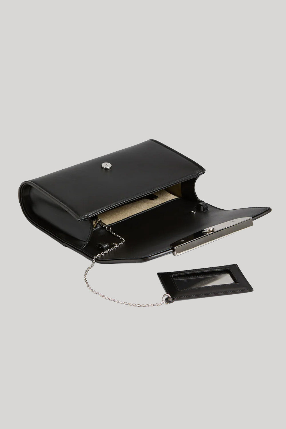 Defined by a sleek, sculptural silhouette, the Louise Pochette is handcrafted in Italy from smooth black nappa leather, a timeless material chosen for its refined finish and lasting appeal. Custom palladium-plated hardware and a discreet magnetic closure refine the design, while interchangeable straps allow it to be styled as a shoulder bag, crossbody, or clutch. Inside, a removable mirror on a chain doubles as a card holder, a discreet detail that enhances its intentional design. Compact yet functional, it holds daily necessities with ease and shifts effortlessly from day to evening.