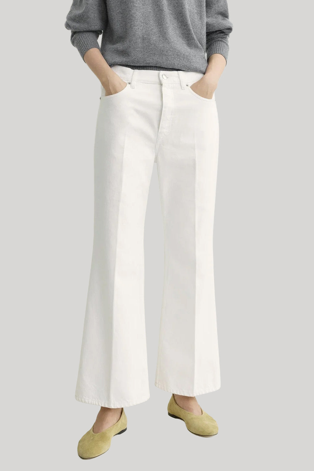 Denim expression of our Kick flare trousers, cut from 100% cotton. A straight-leg silhouette that extends gently at the hem to sit just above the ankle, finished with a zip fly and traditional 5-pocket styling. Complement the length with ballerinas or pumps.